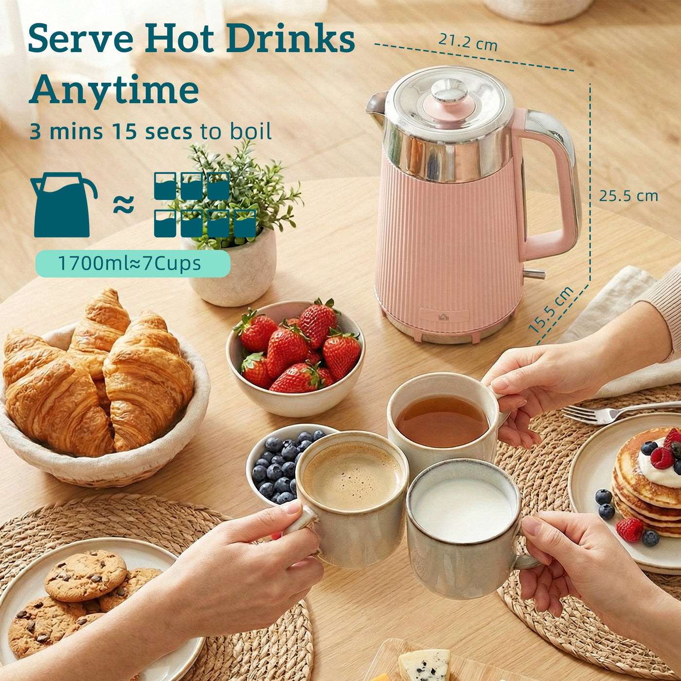 HOMCOM Electric Stainless Steel Kettle and Toaster Set, 3000W 1.7L UK Strix Thermostat Fast Boil Kettle Pink - Pink