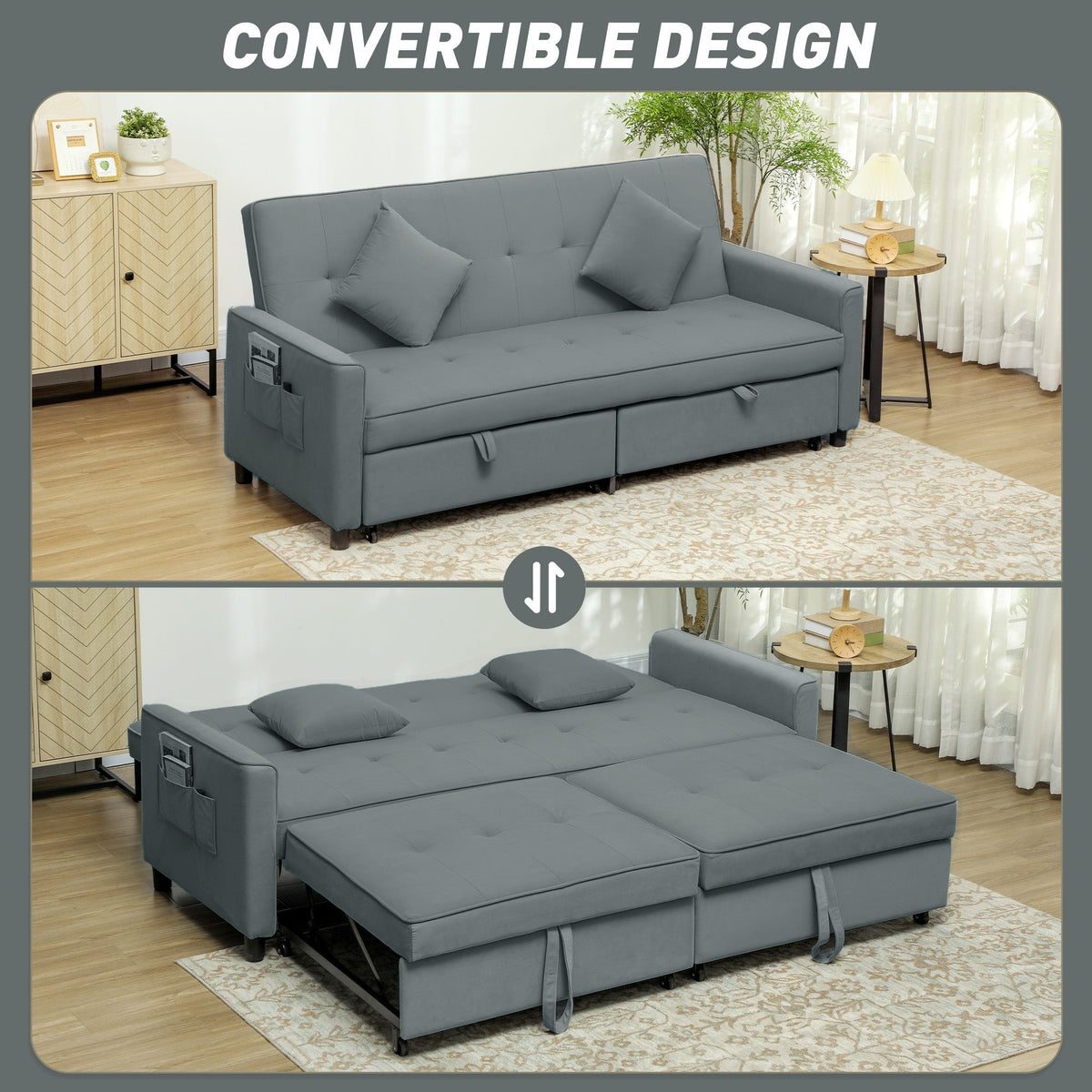 HOMCOM Three-Person Velvet-Feel Sofa Bed - Grey - Grey