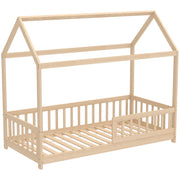 HOMCOM House-Shaped Kids Bed Frame with Guard Rails, Solid Pine Wood Single Bed Frame for Kids Boys and Girls, Natural - Natural wood finish