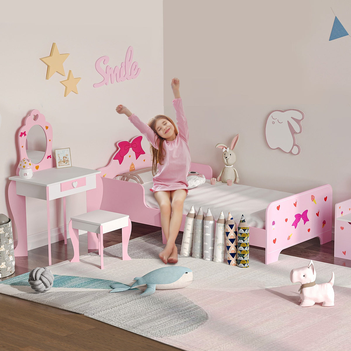 ZONEKIZ 3PCs Kids Bedroom Furniture Set with Bed, Dressing Table and Stool, Princess Themed, for 3-6 Years Old, Pink - Pink