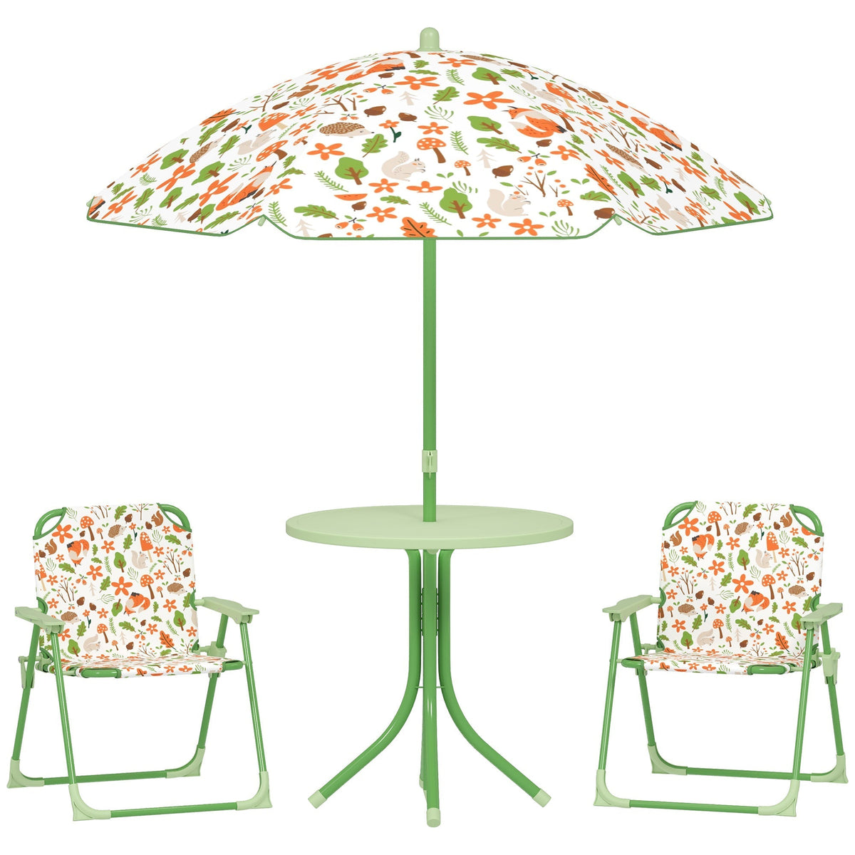 AIYAPLAY 4-Piece Kids Garden Table and Chair Set with Adjustable Parasol, Folding Chairs, Table, Nature Pattern, Green - Green