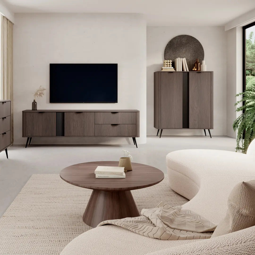 The Veris [Living Room] brings elegance and practicality together in perfect harmony. Featuring deep dunin oak finishes with sleek black accents, each piece is enhanced by rounded sides, black metal legs and handles, and a decorative grooved strip for a touch of sophistication. Stylish, functional, and full of character, Veris [Living Room] adds a refined, contemporary edge to any interior.