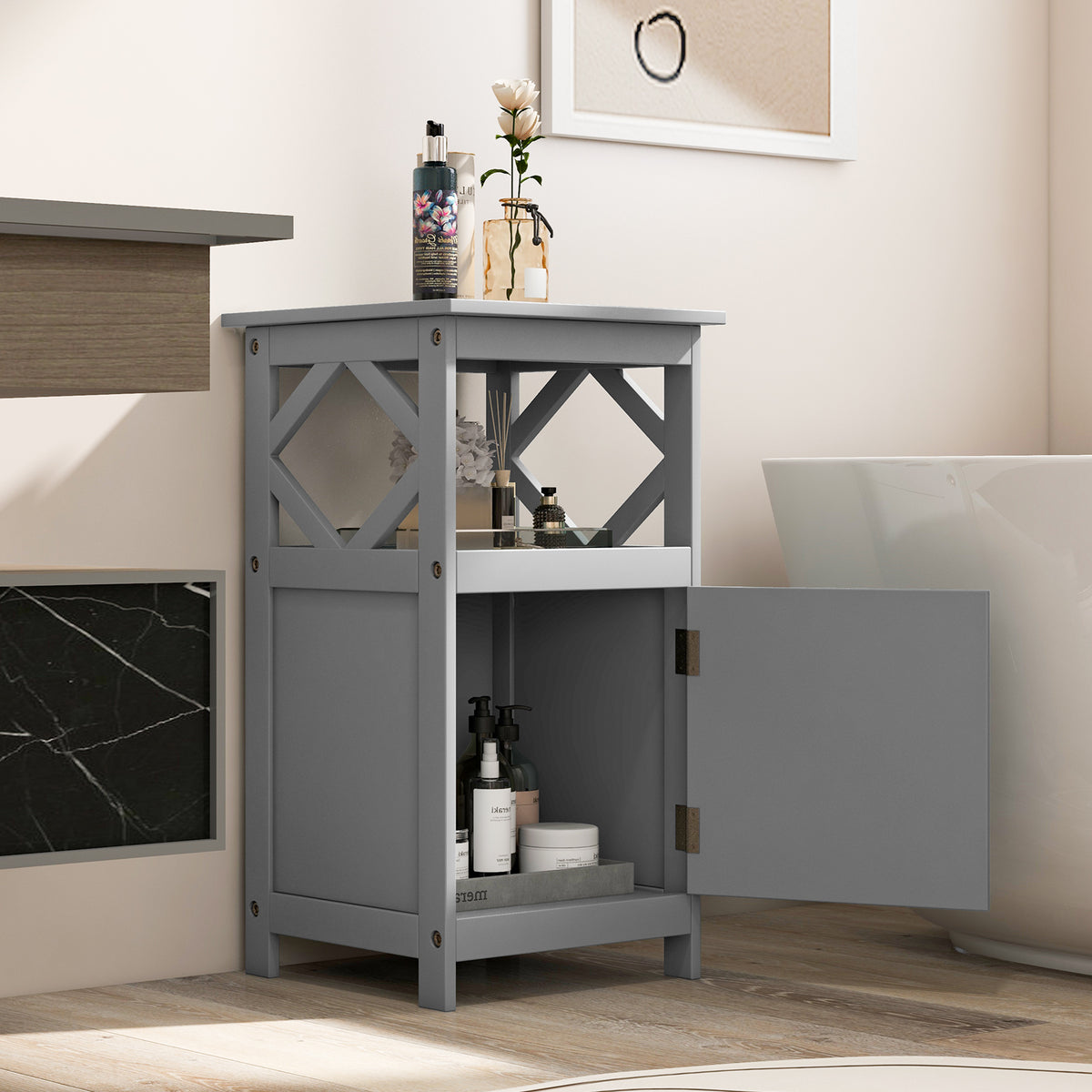 Perfect Organizer for Your Bathroom! This single-door bathroom floor cabinet measures 40 cm x 40 cm x 74 cm (L x W x H). It comes with a door cabinet and 2 tiers of open shelves, providing enough space to well organize your items, such as shampoos, towels, toiletries, papers, decorations, books, etc. Moreover, it is equipped with an anti-toppling device that can fix the cabinet on the wall, enhancing stability and safety. Whether in the bathroom, living room, bedroom, or entryway, our storage cabinet can satisfy your storage needs while not taking up much floor space, keeping your room tidy. The side storage cabinet with an elegant white appearance combines modern charm with a minimalist design that can blend into any home decor easily! Sufficient Storage Space: The single-door bathroom cabinet is designed with a door cabinet to store your bathroom essentials and toiletries, keeping them away from dust and moisture. Besides, the open compartment and large tabletop are suitable for placing items within reach or displaying ornaments. Stable & Safe Structure: The tall freestanding bathroom rack is equipped with an anti-toppling device, which can effectively prevent the cabinet from wobbling or tipping over and keep your family safe. Besides, the thick boards ensure a large loading capacity of 35 kg. Multifunctional Design: This bathroom floor cabinet can also be used as a side cabinet to store daily sundries in the living room, an entryway table to store supplies that you need when going out, or a nightstand in the bedroom, meeting your different needs. Modern & Elegant Appearance: With the combination of the elegant all-white/all-gray appearance, minimalist style, and unique hallow pattern decors, this modern storage cabinet can perfectly blend into your home decor while also adding a touch of elegant charm to your room. Easy Maintenance & Assembly: The bathroom floor cabinet is made of premium veneered MDF board, which is waterproof, smooth, and easy to clean with a wipe cloth. Besides, with clear illustrations and all parts numbered in the instructions, you can easily set it up.