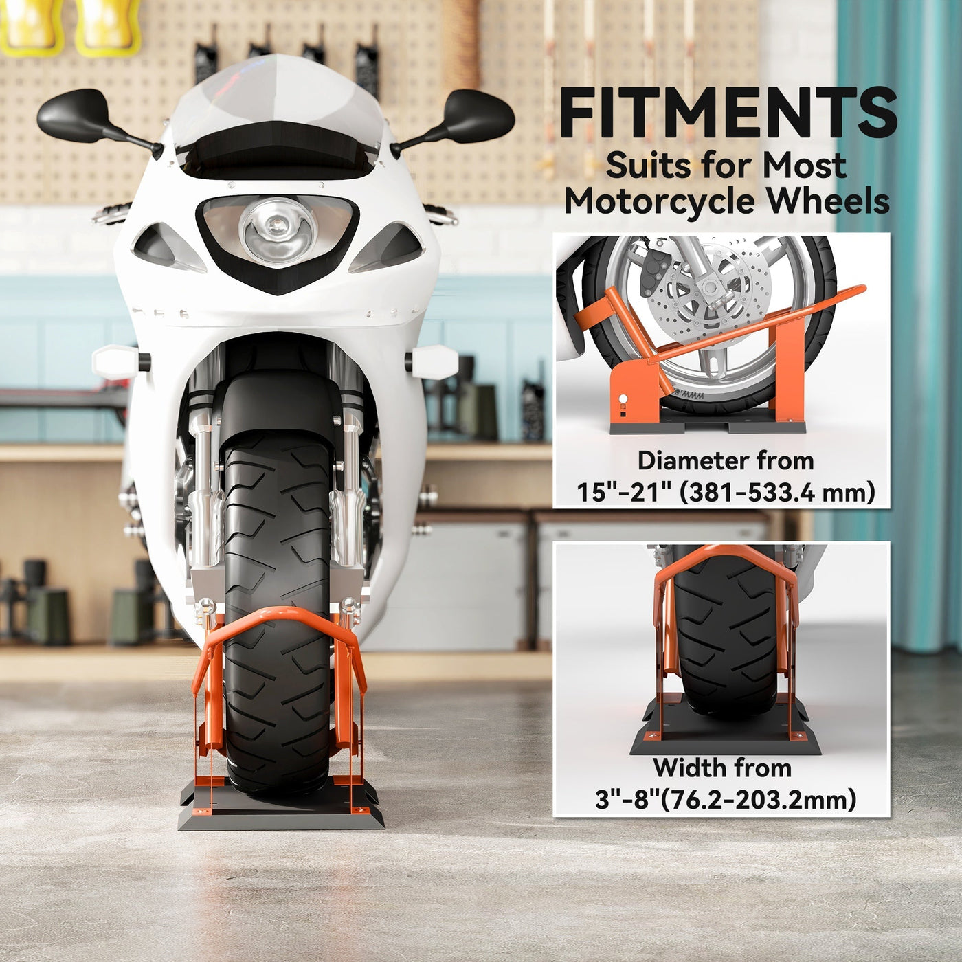 HOMCOM Motorcycle Wheel Chock, 816.5 kg Capacity Heavy Duty Steel Motorcycle Front Wheel Chock Holder with 3 Height Adjustable Holes, Fits 381-533.4 mm Wheels, Orange - Orange