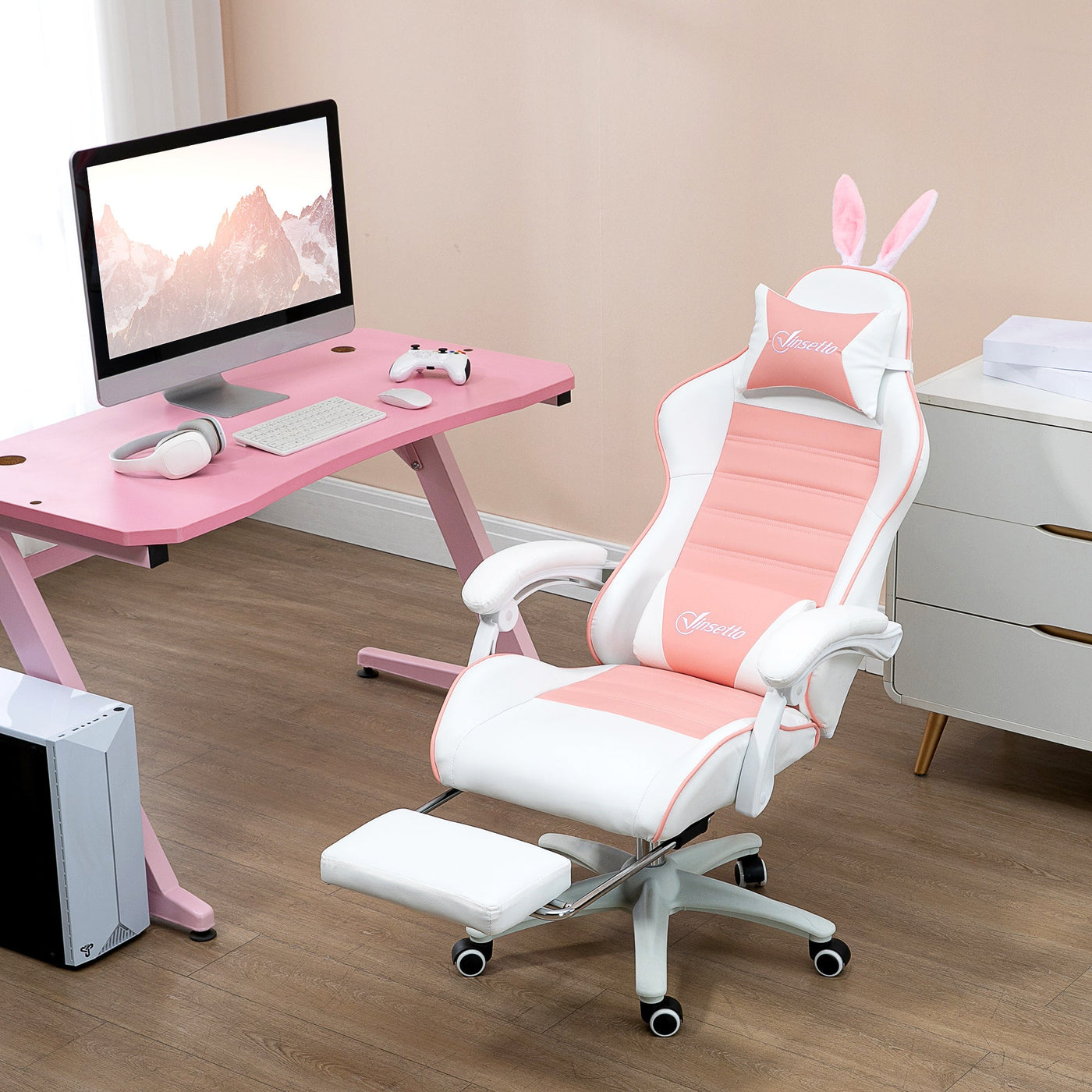 Vinsetto Racing Gaming Chair, Reclining PU Leather Computer Chair with Removable Rabbit Ears, Footrest, Headrest and Lumber Support, Pink - Pink