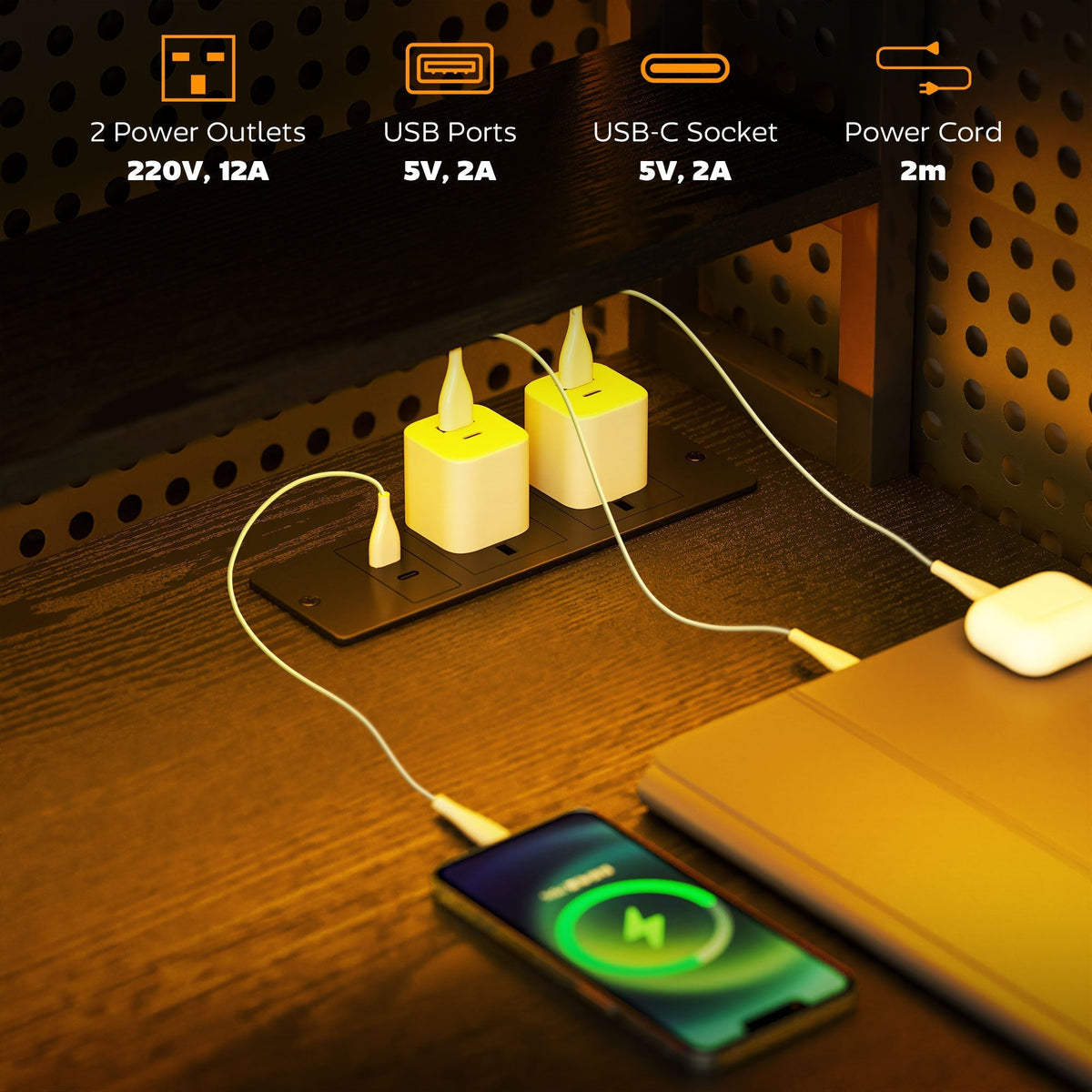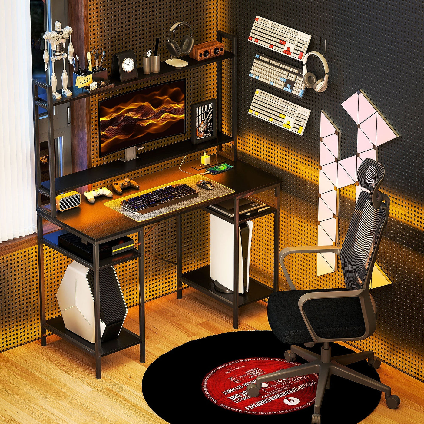 HOMCOM Computer Desk with Power Outlets and LED Lights, Home Office Desk with Monitor Stand, 2 CPU Stands and Storage Shelves, Study Table Gaming Desk with Hutch, Black - Black