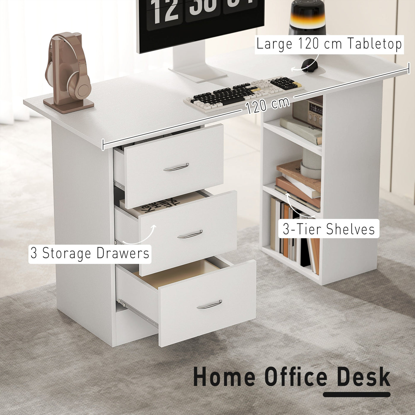 HOMCOM Computer Desk, Writing Table, PC Workstation with 3 Storage Shelves and Drawers, Silver Handle, for Home Office, White - White