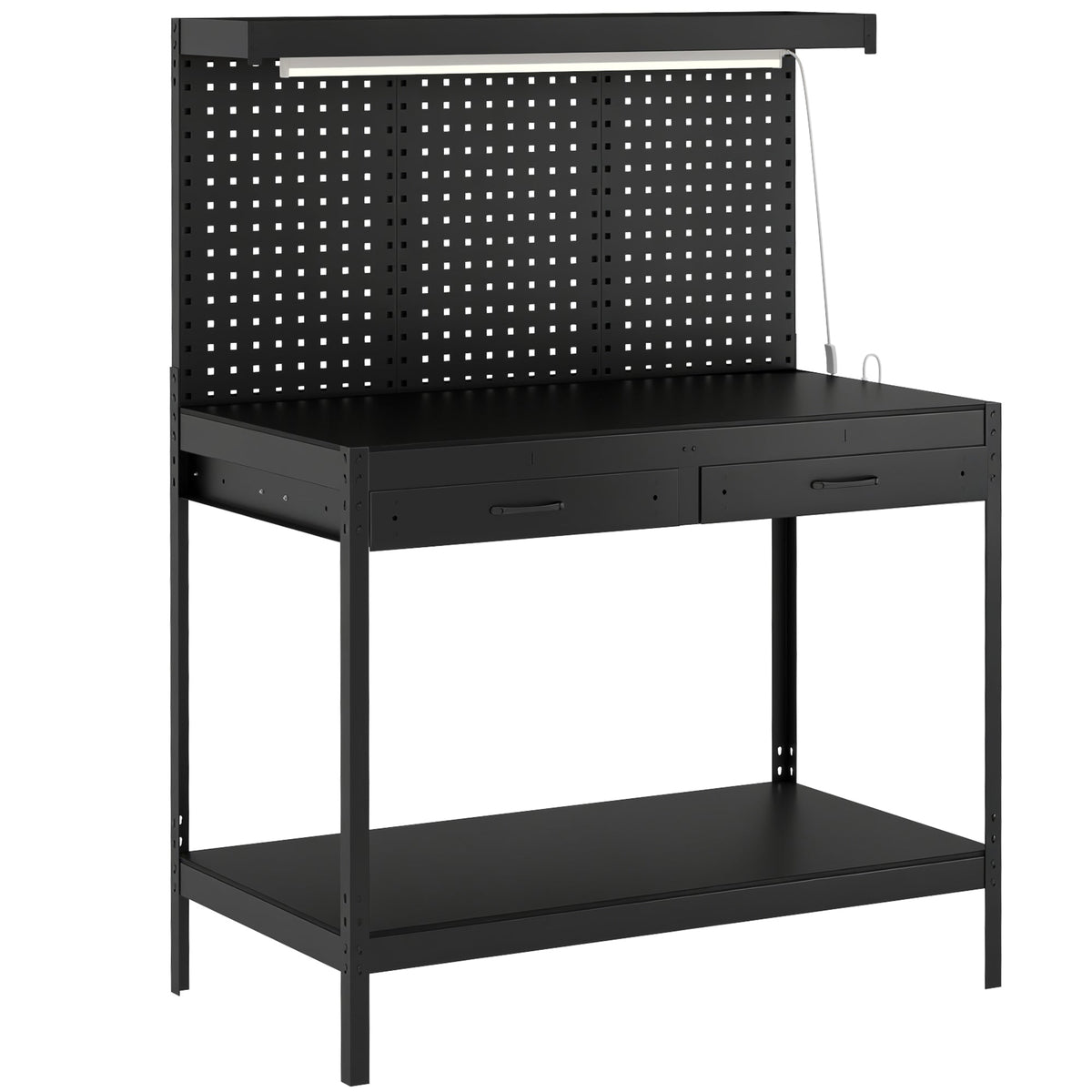 HOMCOM 110 cm Workbench with Pegboard, Heavy Duty Work Table with Power Strip and LED Light, Black - Black