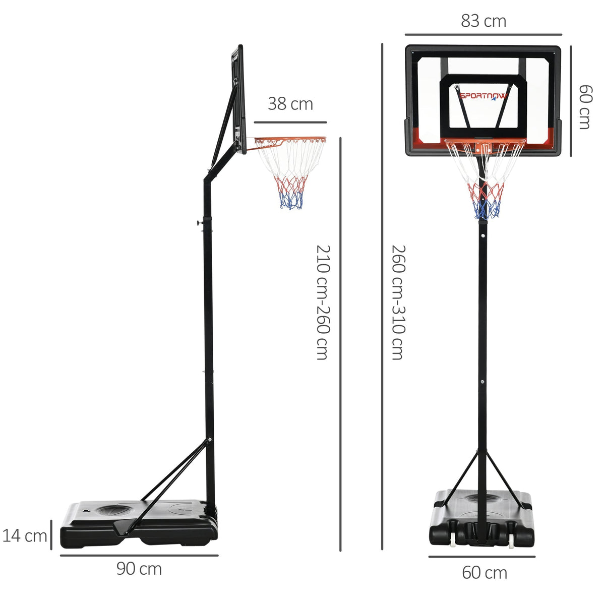 SPORTNOW 2.6-3.1m Adjustable Basketball Hoop and Basketball Stand w/ Backboard and Weighted Base, Portable on Wheels, Black - Black, Red and Orange