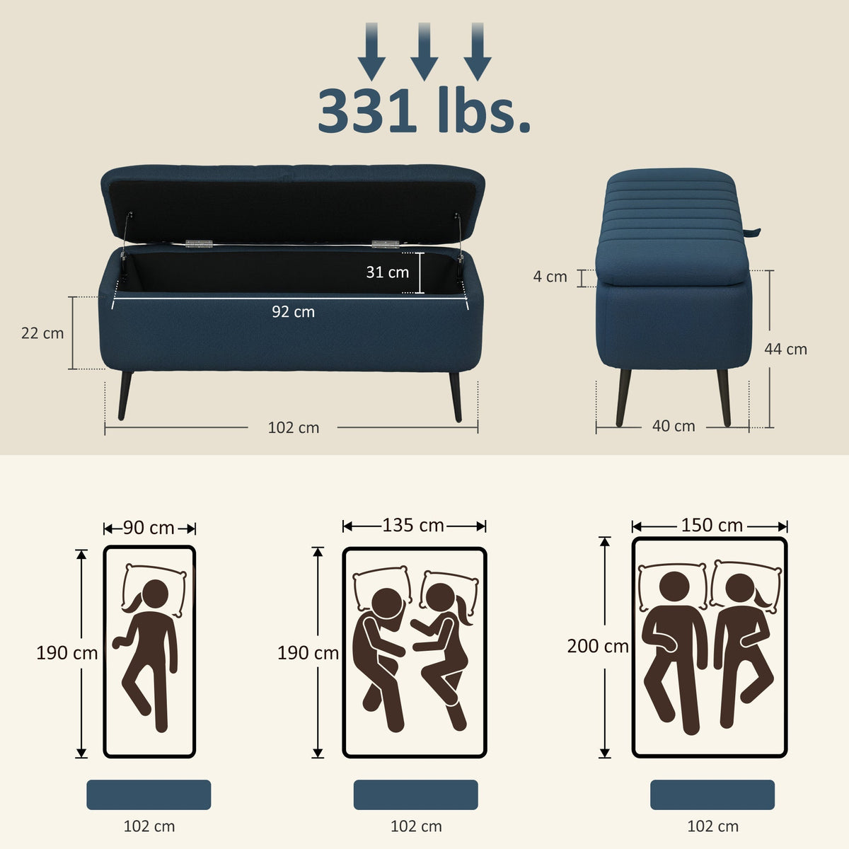 HOMCOM 92 x 31cm Linen-Look Storage Ottoman - Dark Blue