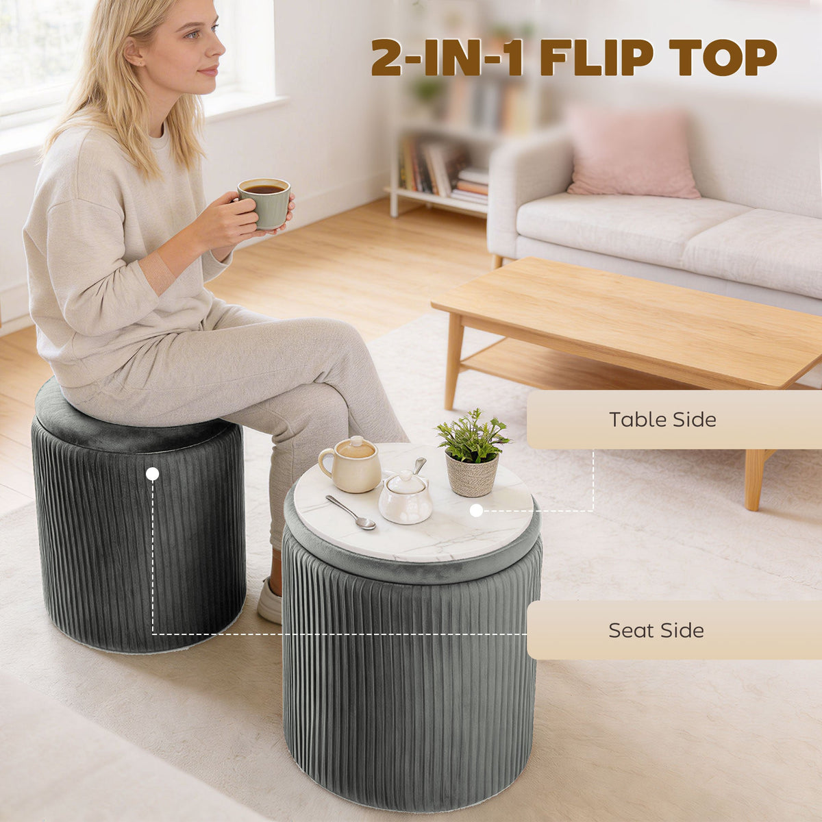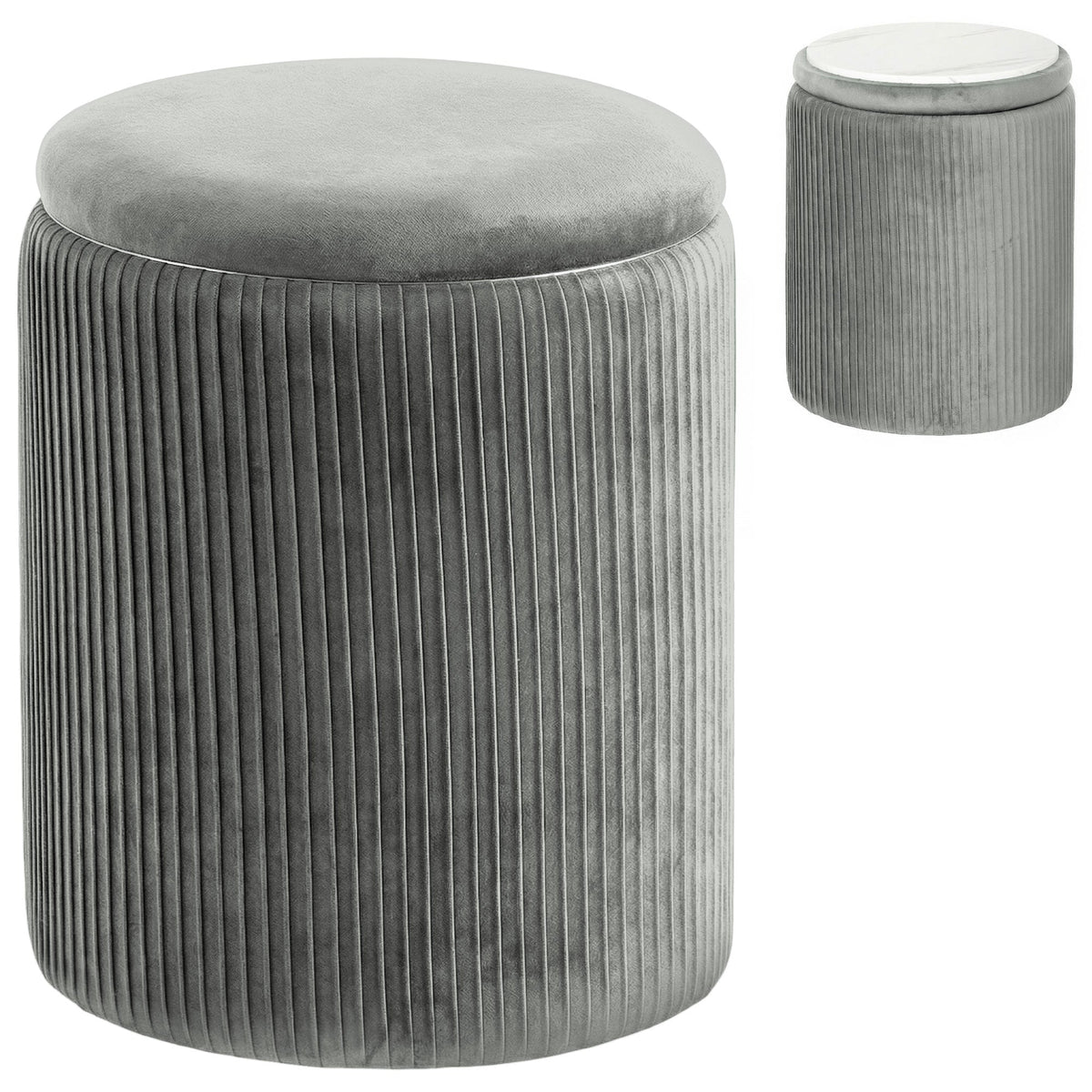 HOMCOM Storage Ottoman Modern Velvet Round Foot Stool for Living Room Bedroom 45 cm Grey - Grey