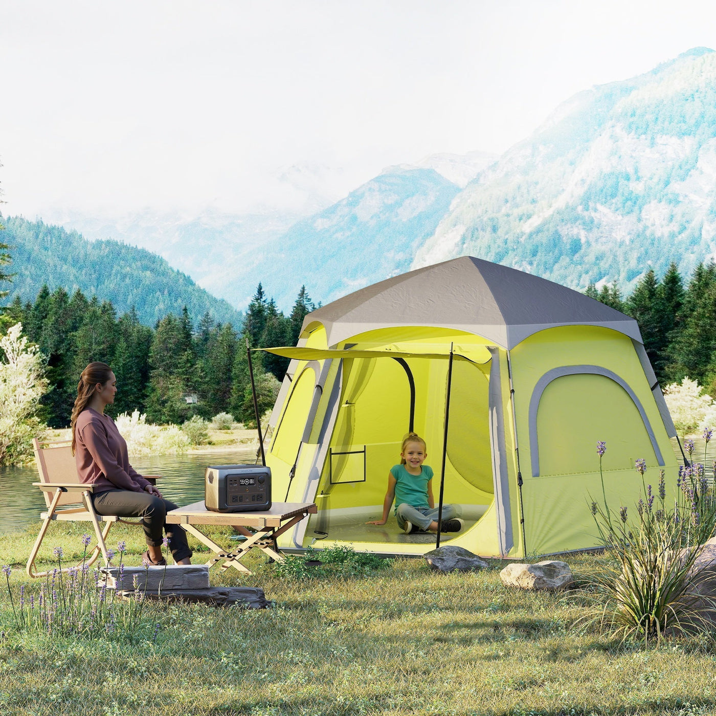 Outsunny Instant Pop Up Camping Tent, 2/3/4 Person Easy Setup Dome Family Tent with Vestibule, Rainfly, 4 Mesh Windows & 2 Doors, Hexagonal Design, Waterproof & UV Protected, Yellow Green - Yellow