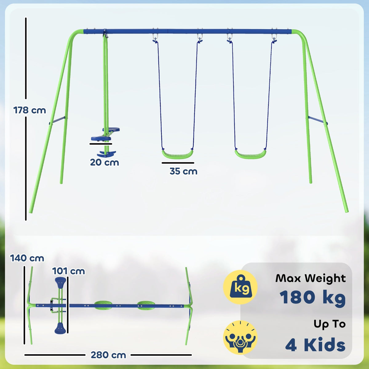 Outsunny Metal Garden Swing Set Height Adjustable Children Outdoor Backyard Play Set for Toddlers Over 3 Years Old, Green - Green