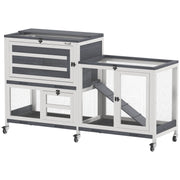 PawHut Wooden Rabbit Hutch with Run, 2-Tier Guinea Pig Hutch with Run, Wheels, 3 Plastic Trays, 2 Openable Top, for 2-3 Rabbits - Grey