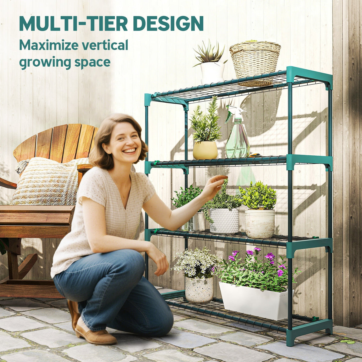 Outsunny 4-Tier Plant Stand Indoor Outdoor, Set of 2 Metal Plant Shelf with Rack Buckles for Easy Assembly, Flower Display Rack - Green