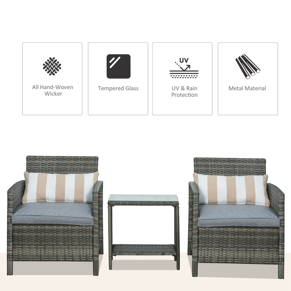 Outsunny 3 Pieces Rattan Bistro Set, Wicker Garden Furniture Set, Glass Top 2-tier Coffee Table and Chairs Set with Pillows and Washable Cushions for Outdoor, Patio, Balcony, Grey - Grey