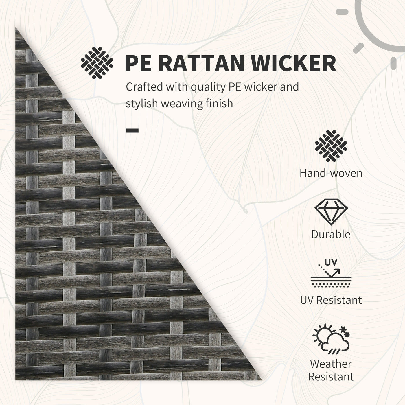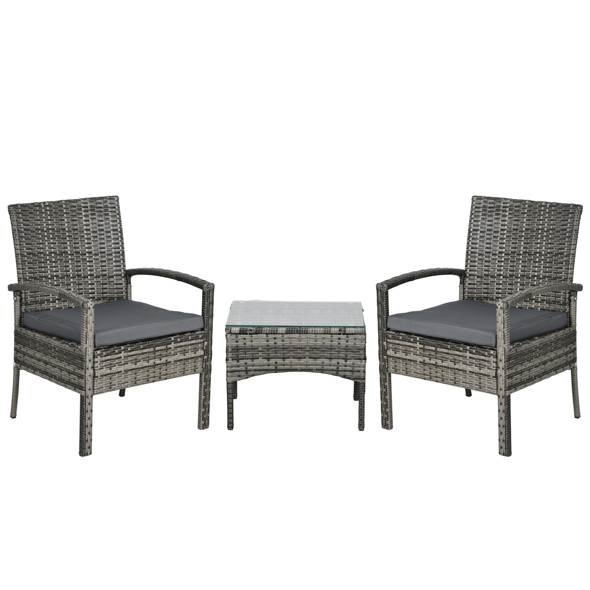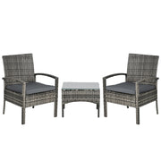 Outsunny 3 Pieces Rattan Bistro Set, Wicker Garden Furniture Set with Glass Top Coffee Table and Chairs, Washable Cushions for Outdoor, Patio, Balcony, Mixed Grey - Grey