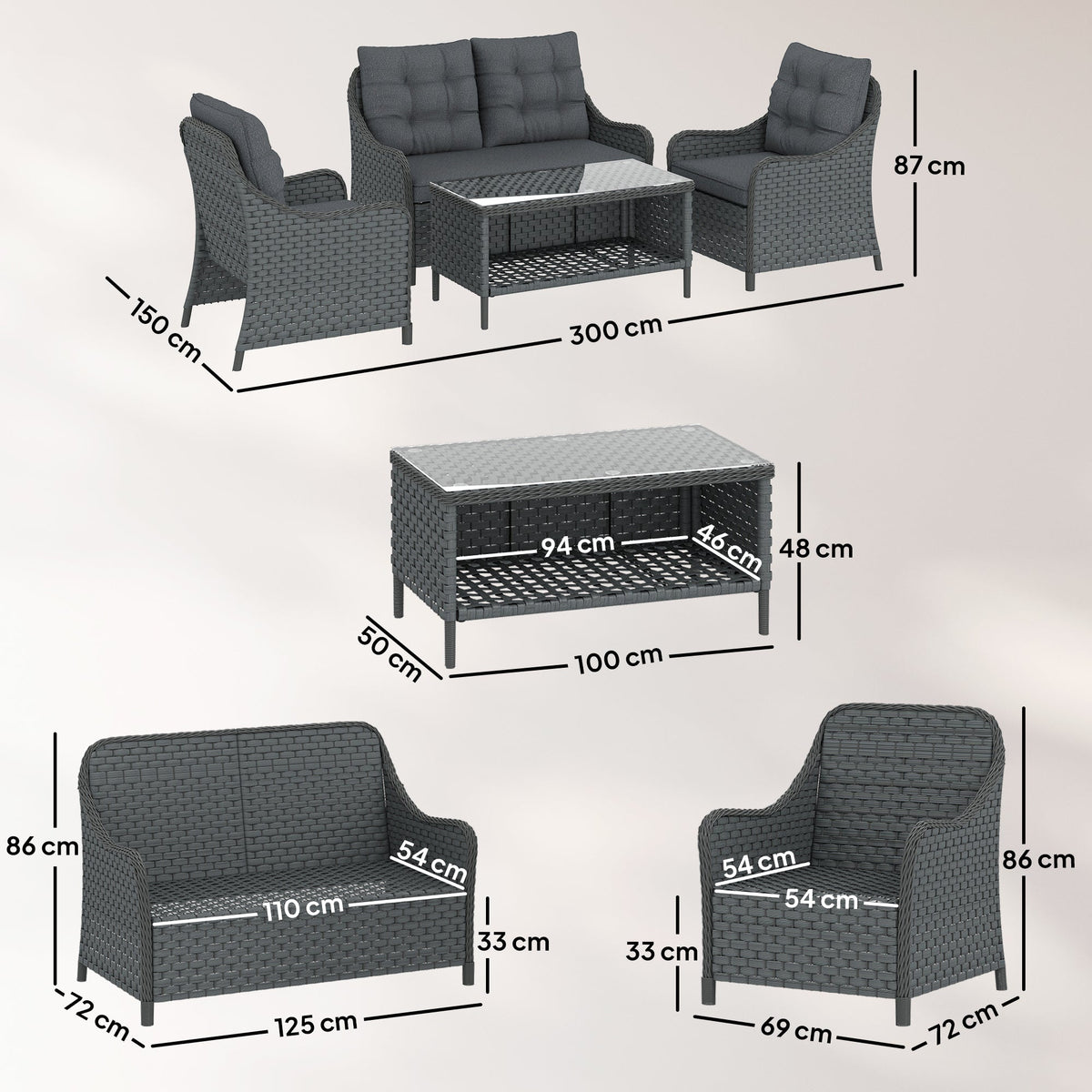 Outsunny 4-Piece Wicker Patio Furniture Set with 2 Armchairs, Loveseat, Glass Coffee Table, Conversation Sofa Set, Dark Grey