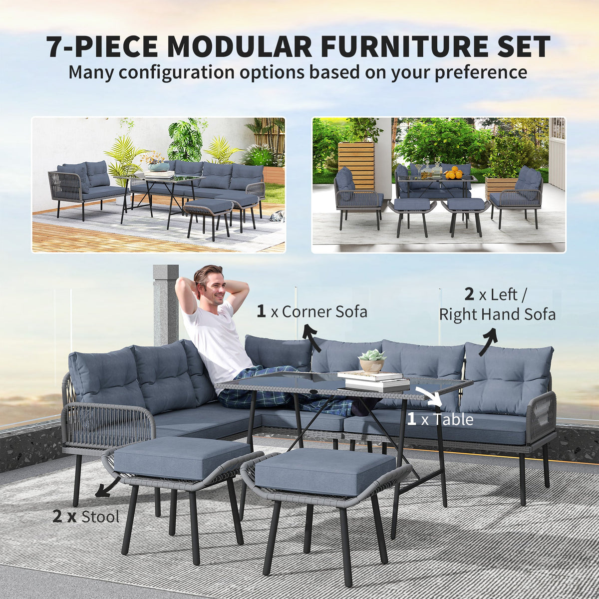 Outsunny 6 Piece Rattan Garden Furniture Set, 8 Seater Garden Corner Sofa with Cushions and Glass Top Table, Sectional Outdoor Furniture Conservatory Set for Patio, Charcoal Grey - Charcoal grey