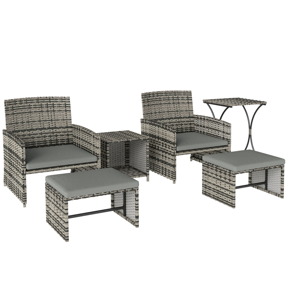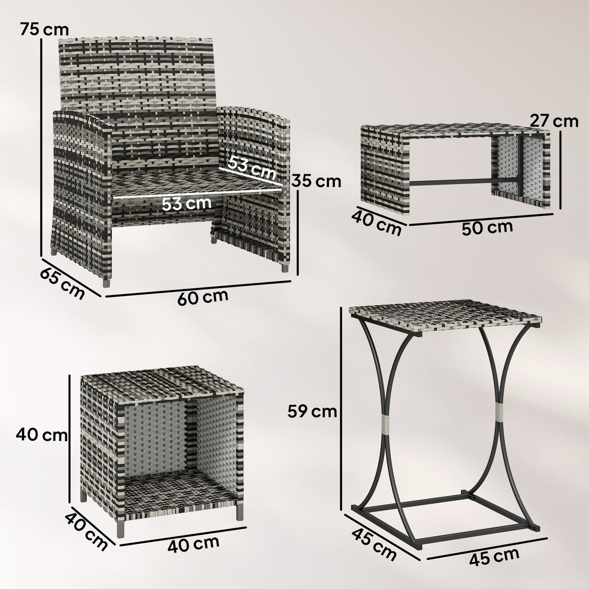 Outsunny 6 Piece Rattan Garden Furniture, Space-Saving Patio Furniture Set with Nesting Tables, Chairs, Stools, Cushions, Grey - Grey
