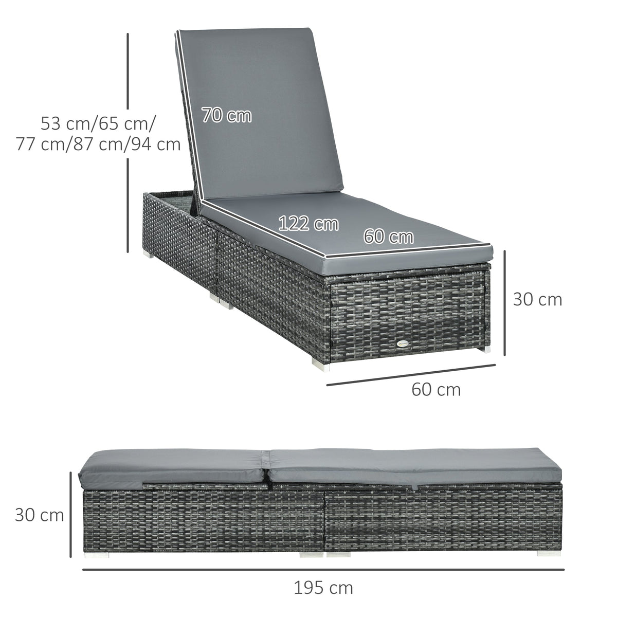 Outsunny PE Rattan Sun Loungers set of 2 with Cushion, Outdoor 2 Pieces Garden Sunbed Furniture with 5-Level Recliner Backrest, Reclining Patio Wicker Bed Chair, Grey - Grey