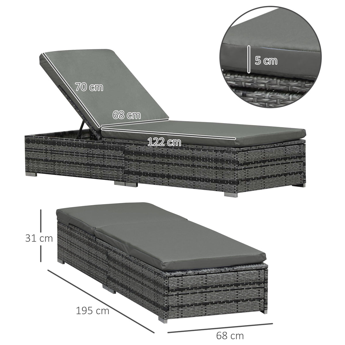 Outsunny PE Rattan Sun Loungers with Cushion, Outdoor Garden Sunbed Furniture with 5-Level Recliner Backrest, and Armrest, Set of 2, Grey - Grey