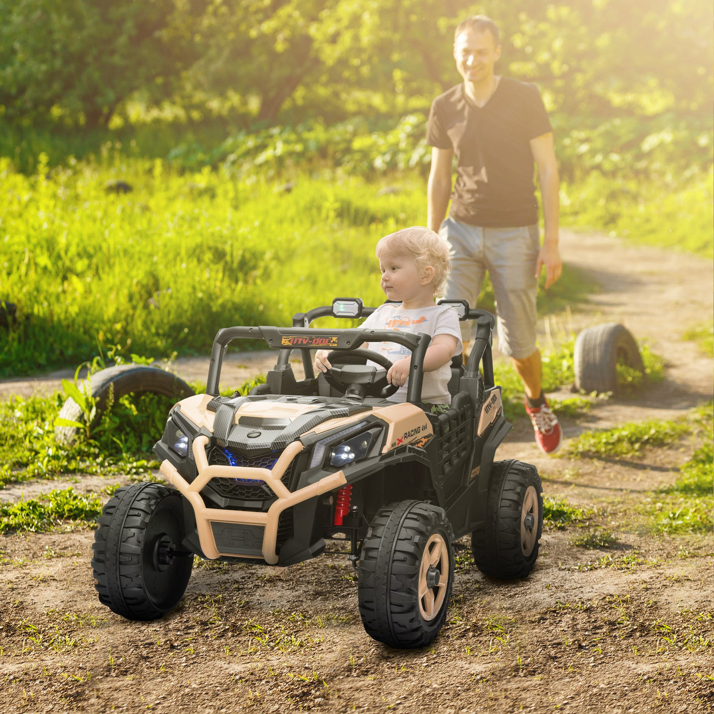 AIYAPLAY 24V 2 Seater Kids Electric Car with Remote Control, Suspension System, Slow Start, 3 Speeds, for 3-8 Years, Khaki - Khaki