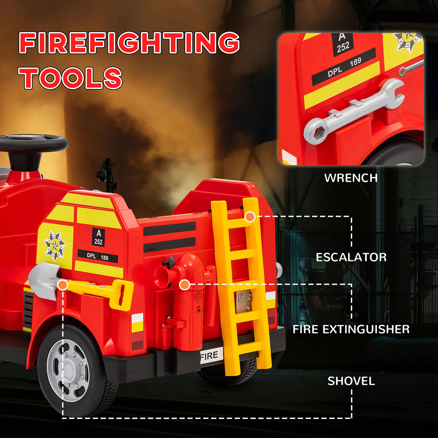AIYAPLAY Ride On Fire Truck, 12V Kids Electric Car with Siren, Flashing Lights, Firefighting Tools, Music, Horn, Slow Start, Red - Red