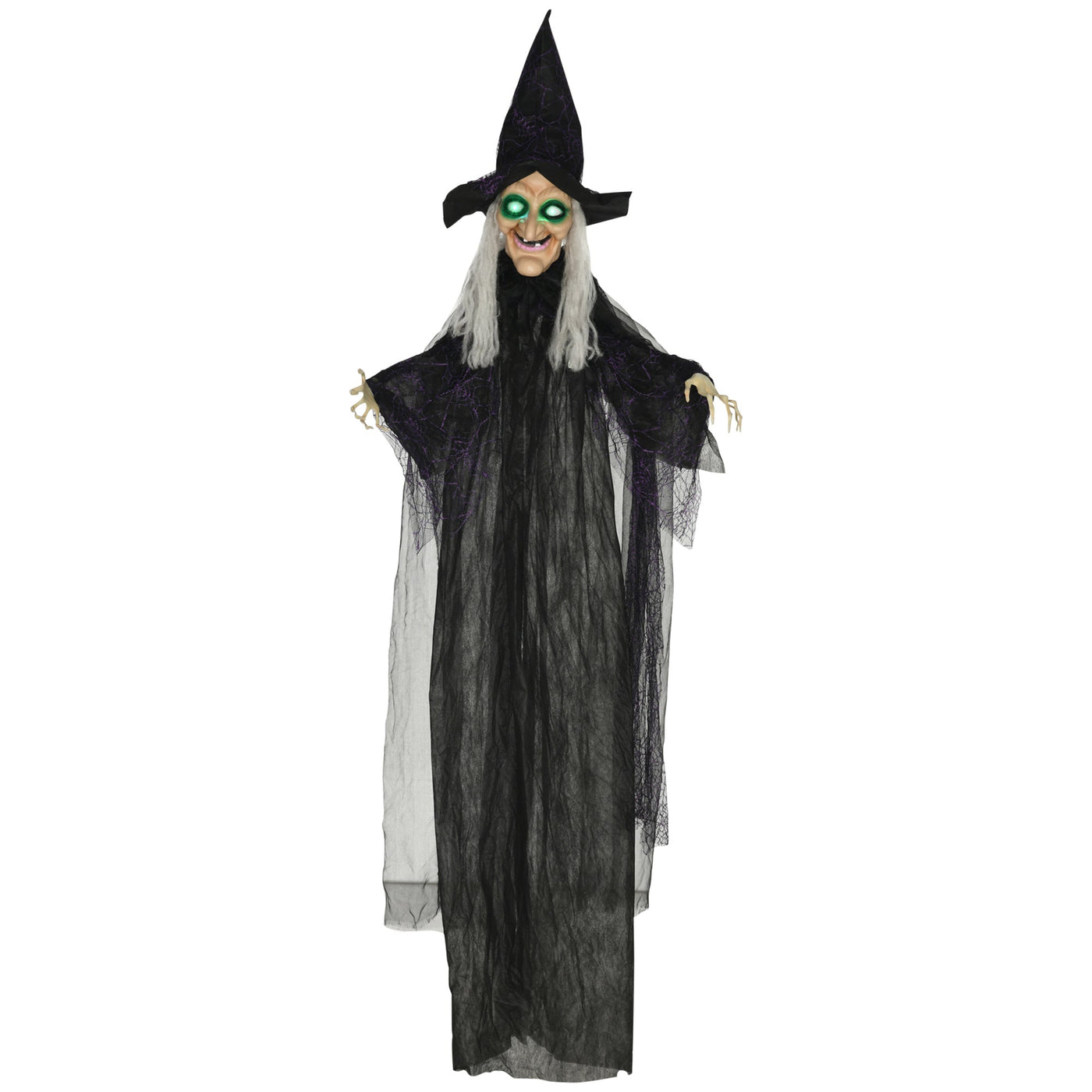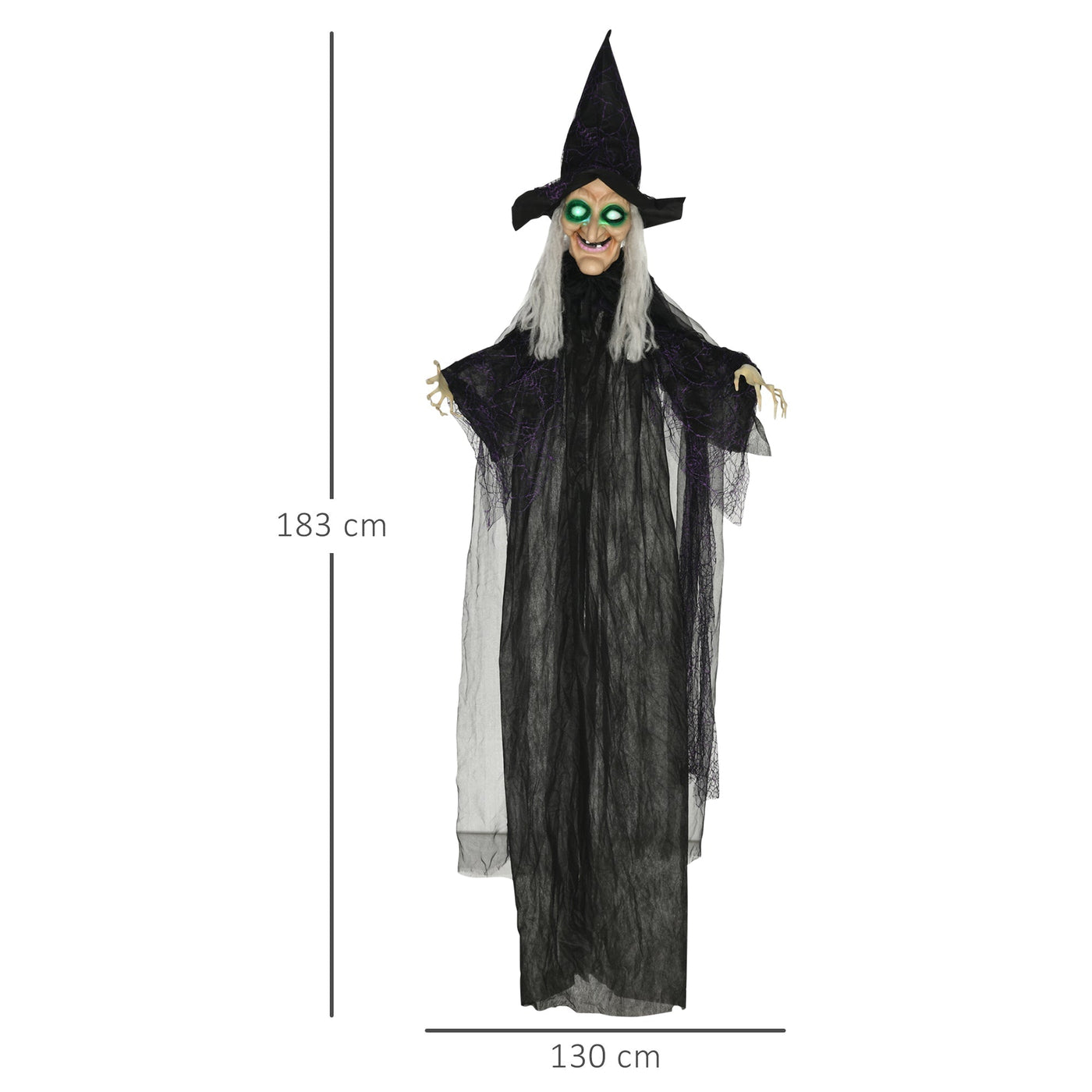 HOMCOM 6ft Outdoor Halloween Decoration Witch, Hanging Witch Prop Life Size with Sound and Motion Activated, Light Up Eyes, Talking Sound, Posable Arms - Black