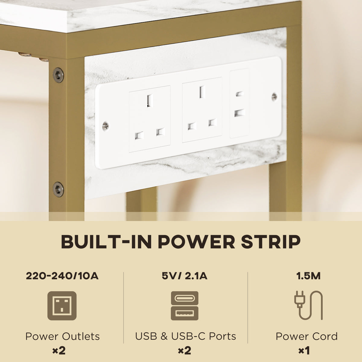 HOMCOM C Shaped Side Table with Charging Station and Faux Marble Top - White - White
