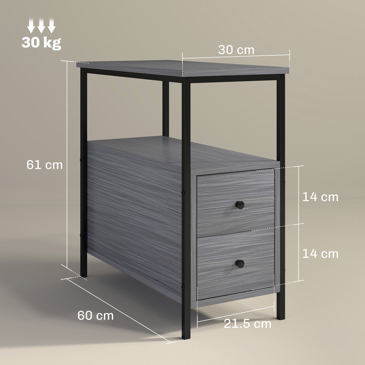 HOMCOM Side Table, Narrow Bedside Table with 2 Drawers and Storage Shelf, Industrial End Table with Metal Frame for Small Spaces, Grey Wood Grain - Grey