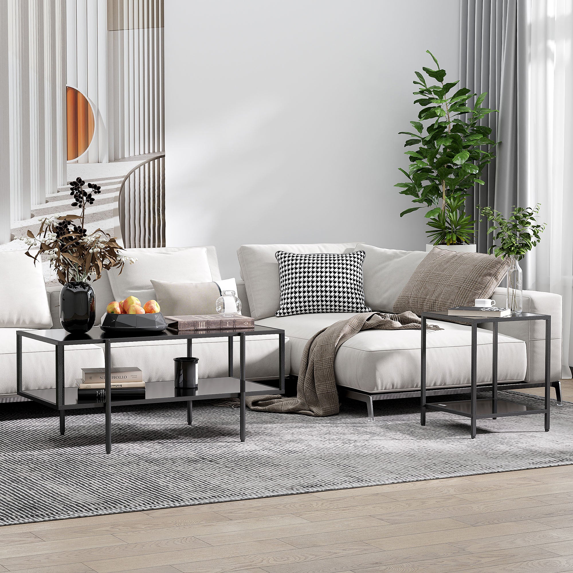 HOMCOM Tempered Glass Side Table with Storage, Modern 2-Tier Bedside Table with Steel Frame, Black - Black