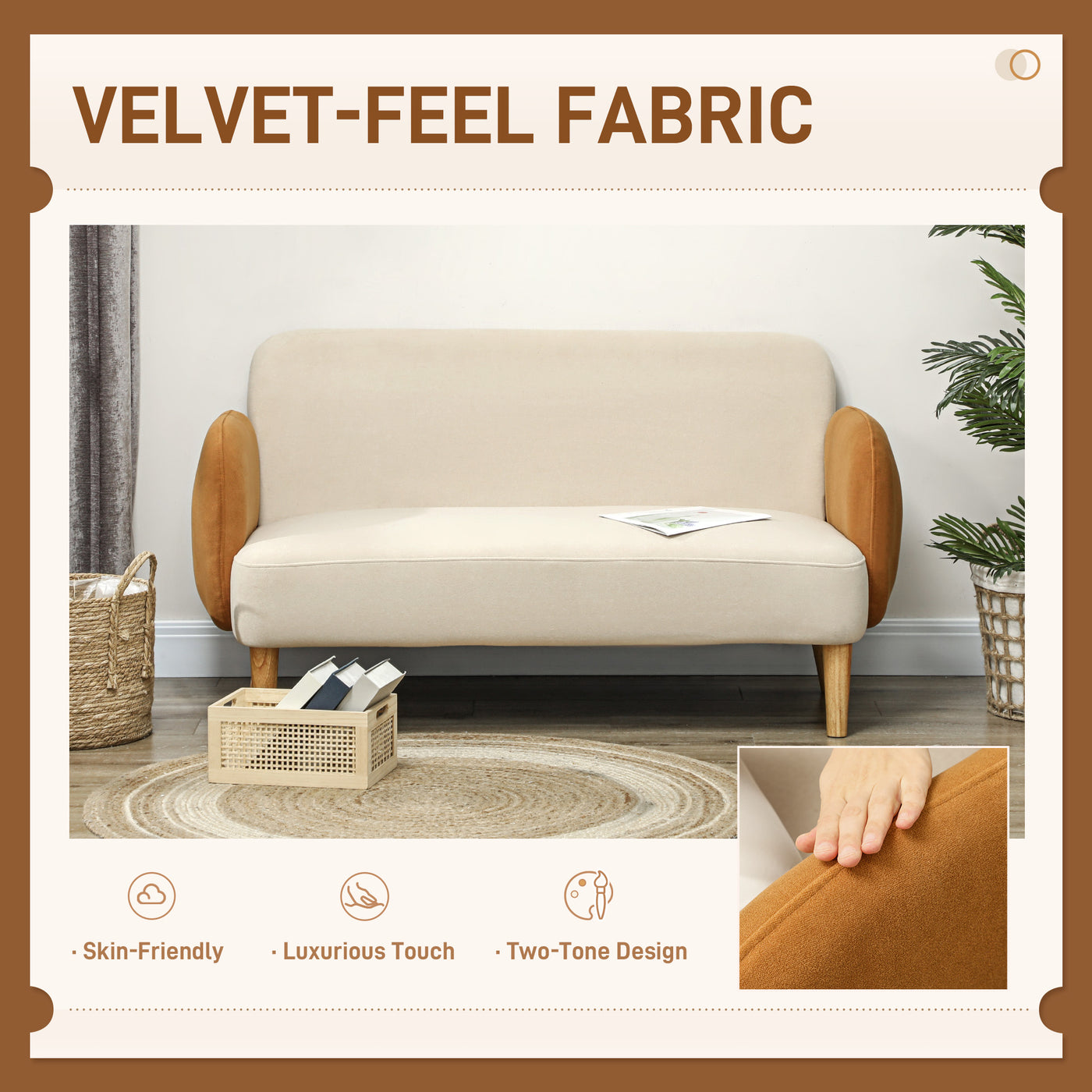 HOMCOM Two-Seater Velvet-Feel Mid Century Sofa - Cream/Orange