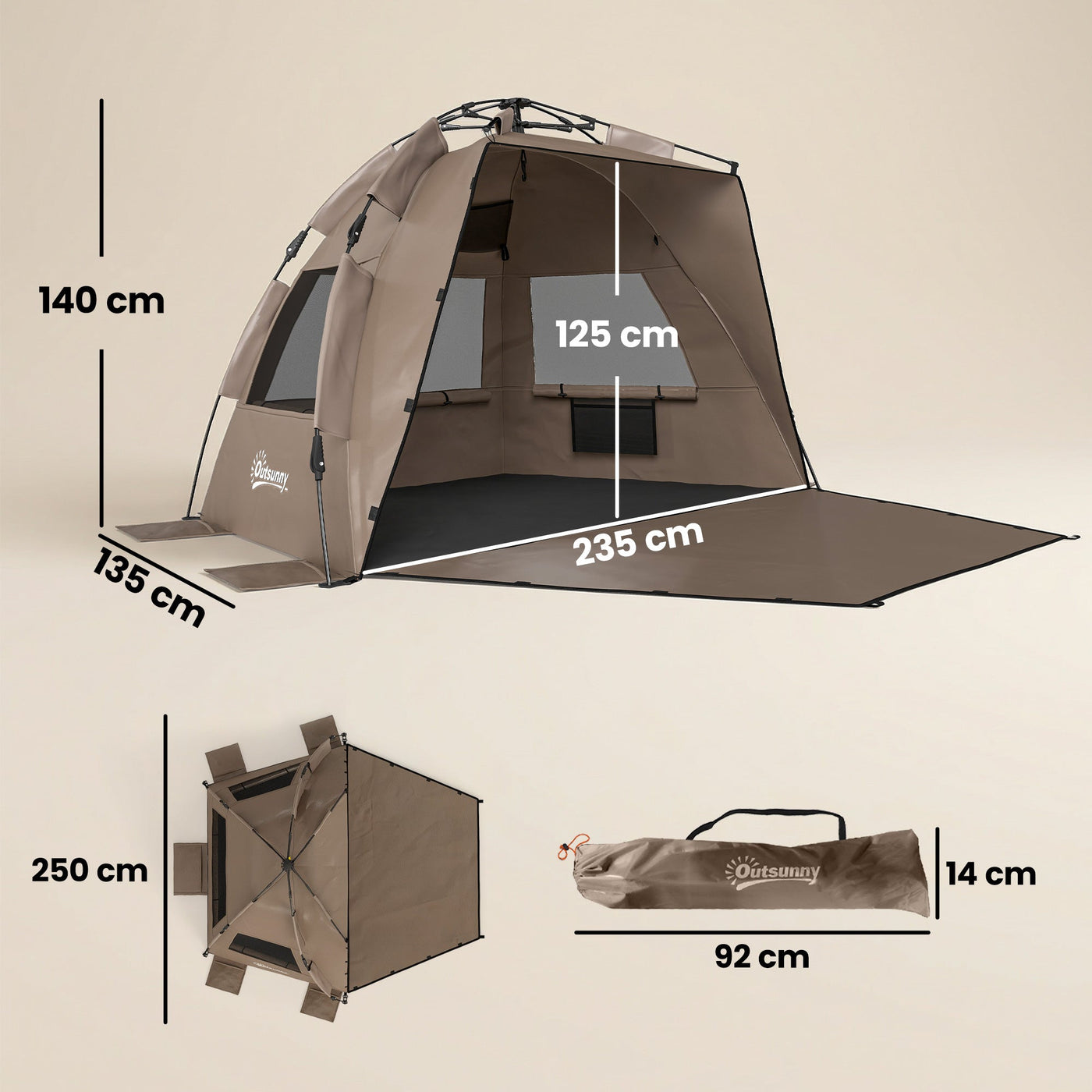 Outsunny 2-3 Person Pop Up Beach Tent, UPF15+ Sun Shelter with Extended Floor, Sandbags, Mesh Windows and Carry Bag, Brown - Brown