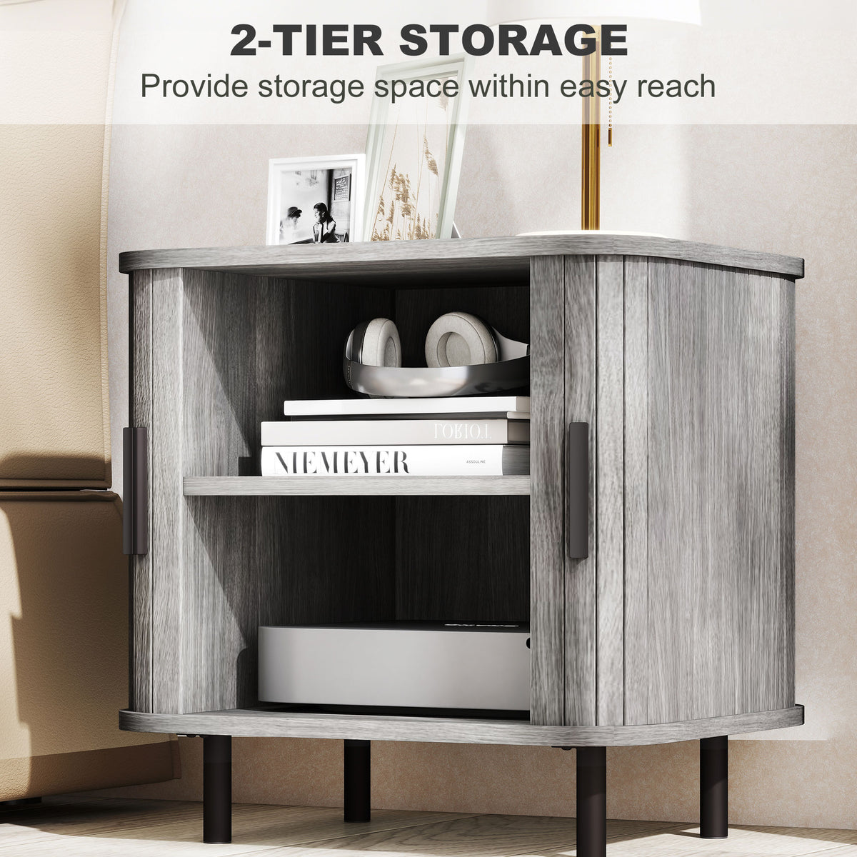 HOMCOM Bedside Table, Nordic Side Table with Roller Shutter Style Sliding Doors and Metal Legs for Bedroom, Living Room, Grey - Grey