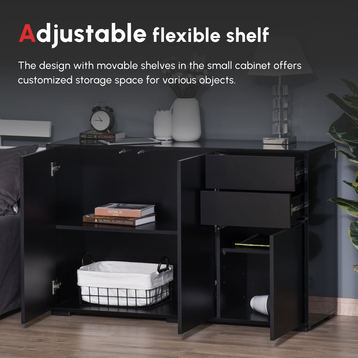 HOMCOM High Gloss Frame Sideboard, Push-Open Design with 2 Drawers for Living Room, Bedroom, 74H x 79W x 36Dcm, Black - Black