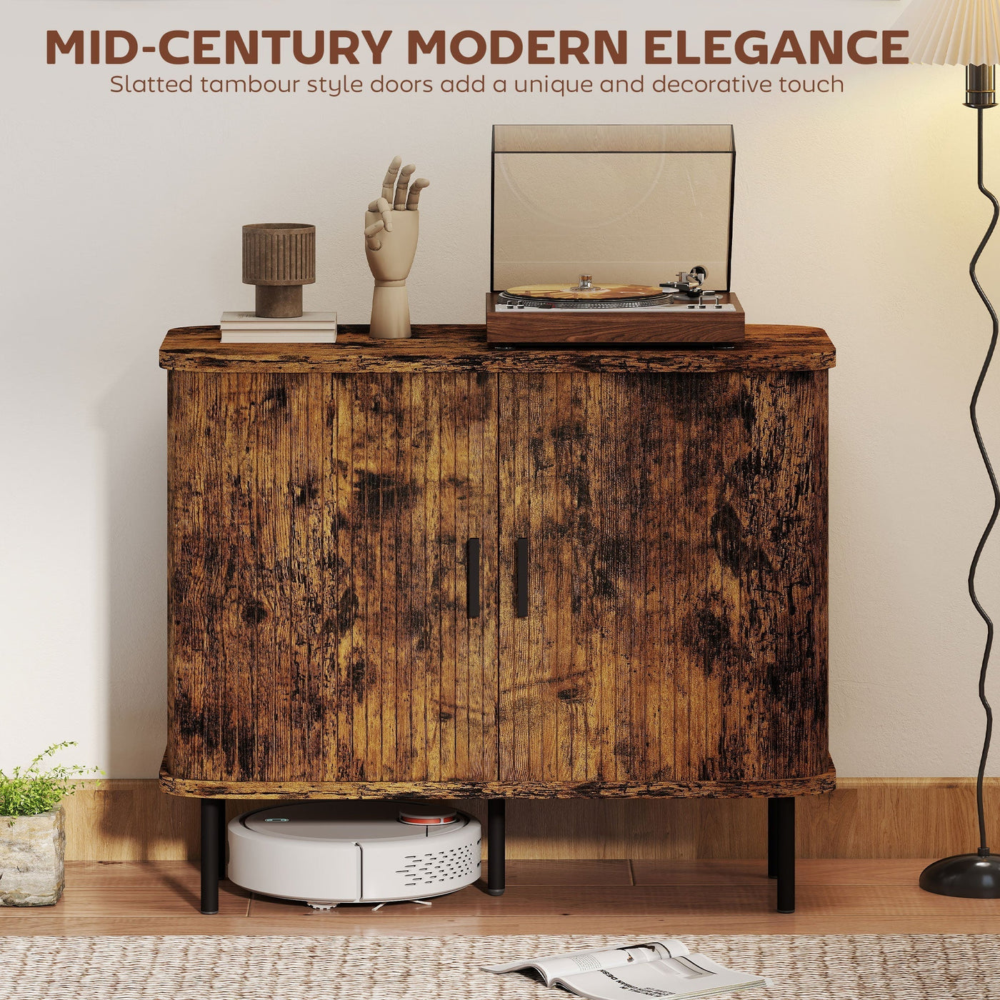 HOMCOM Mid-Century Modern Sideboard Storage Cabinet with Slatted Tambour Sliding Doors, Kitchen Cabinet with Steel Legs, Rustic Brown - Rustic Brown