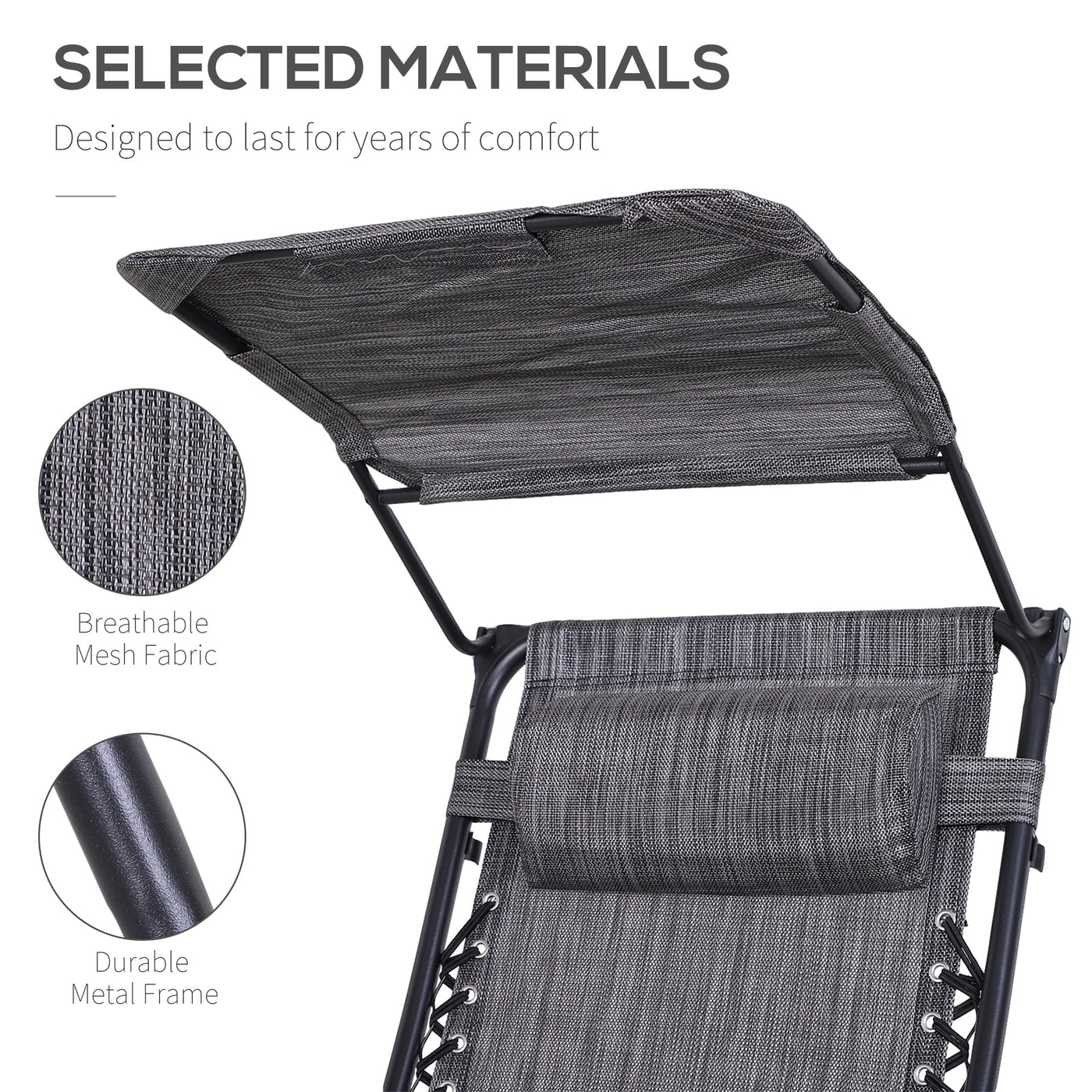 Outsunny 2 Piece Foldable Reclining Garden Chair with Headrest, Zero Gravity Deck Sun Lounger Seat Chair with Footrest, Armrest, Cup Holder & Canopy Shade, Grey - Grey