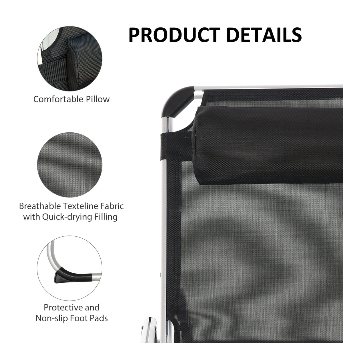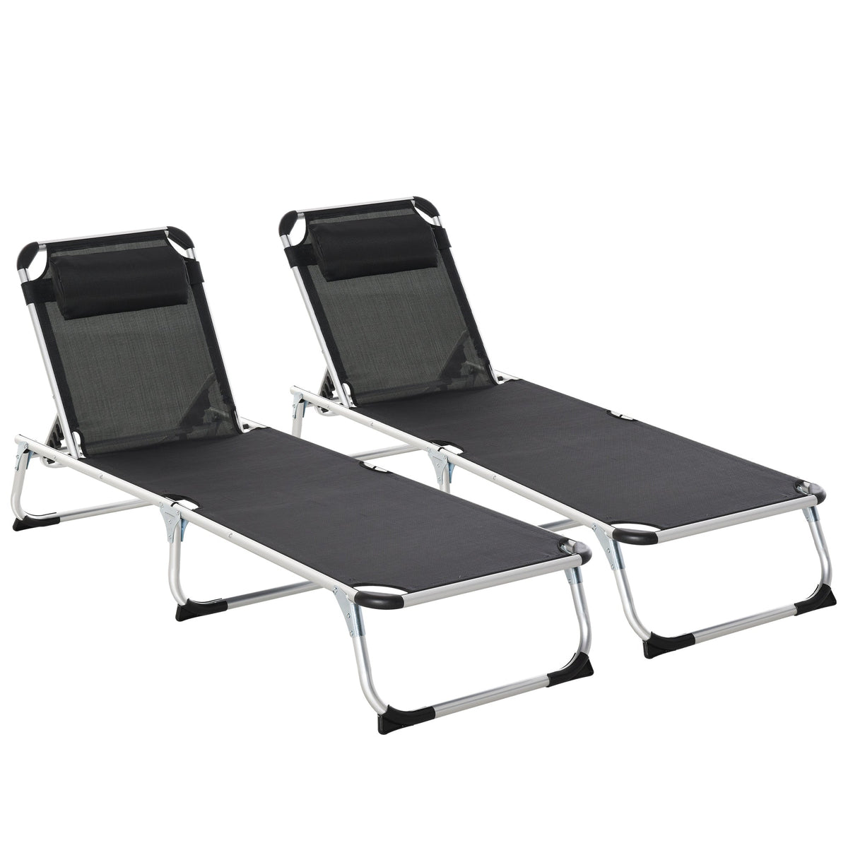 Outsunny Foldable Outdoor Sun Loungers Set of 2, Reclining Lounge Chair Camping Bed Cot with Pillow 4-Level Adjustable Back Aluminium Frame, Black - Black
