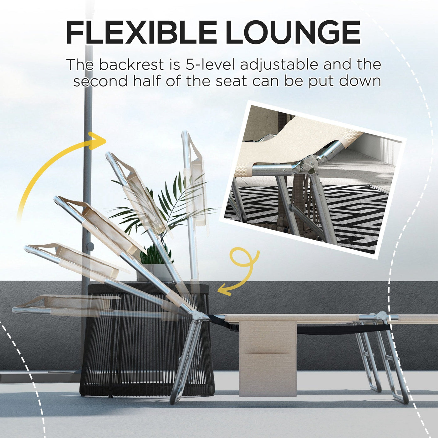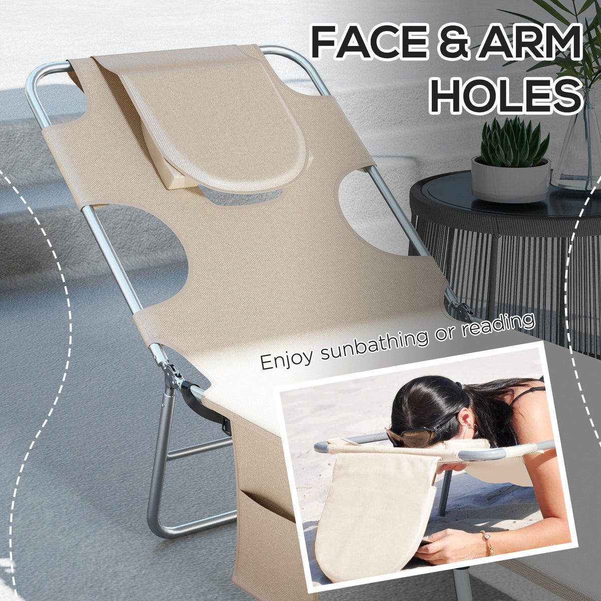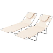 Outsunny Foldable Sun Lounger Set of 2, Beach Chaise Lounges with Reading Hole, Arm Slots, 5-Position Adjustable Backrest, Side Pocket, Pillow for Patio, Garden, Beach, Pool, Beige - Beige