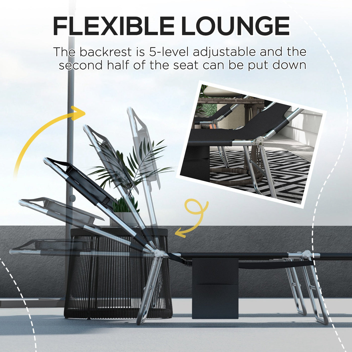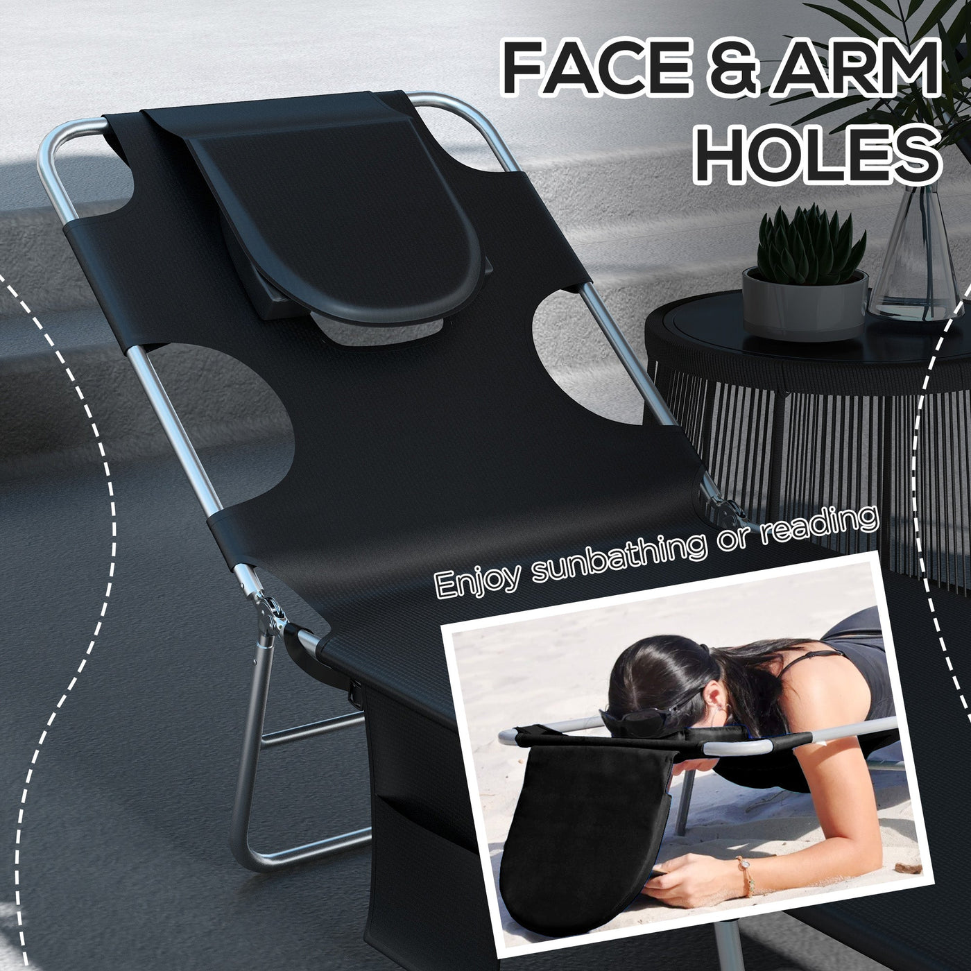 Outsunny Foldable Sun Lounger Set of 2, Beach Chaise Lounges with Reading Hole, Arm Slots, 5-Position Adjustable Backrest, Side Pocket, Pillow for Patio, Garden, Beach, Pool, Black - Black