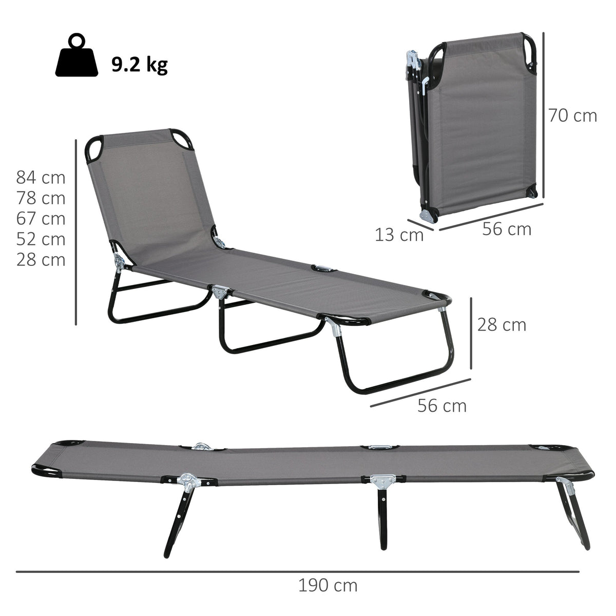 Outsunny Garden Sun Lounger, with Five-Position Back - Grey - Grey