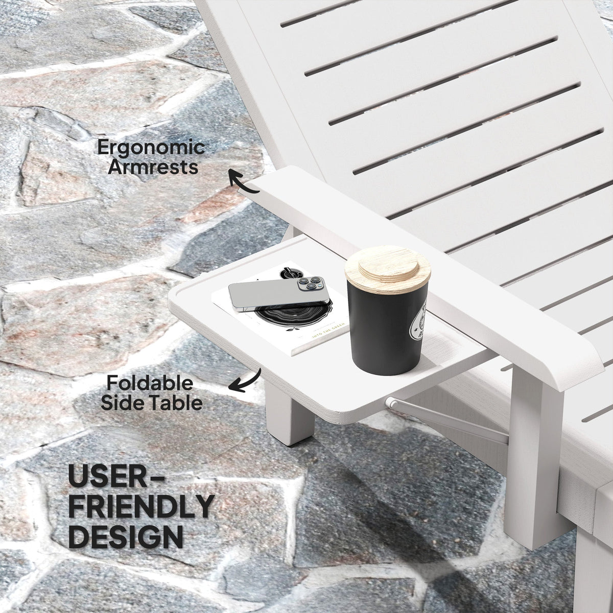 Outsunny Set of 2 Resin Reclining Sun Loungers for Garden, 5 Positions Adjustable Outdoor Chaise Lounge Chairs with Wood Texture Surface, Armrests, Foldable Side Table for Garden, Beach, White - White
