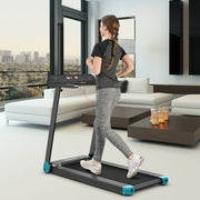 This foldable and portable running machine will not occupy too much home space. You can listen to the quality sound through bluetooth speaker, the APP can directly control the treadmill and record your fitness data. And the LED display feedback on your sports data (time, speed, distance, calorie and heart rate) directly as well. If you are looking for a 2 in 1 folding treadmill for home like this, do not hesitate to place an order! ● 2 Ways to Know Your Data: The home treadmill not only has an LED display to show your different sports data, such as time, speed, distance, calorie and heart rate, but also can be connected with APP to record your fitness data. Besides, you can use the APP to control the folding treadmill, share the results with the community and compete with others, etc. ● Excellent Shock Absorption Ability: Designed with 5-layer running belt, this folding treadmill brings comfortable running experience. At the same time, the shockproof and anti-slip surface reduces impact on your knees, joints and ankles, offering safe protection for your legs. ● Bluetooth Speaker and Device Holder: By connecting blue tooth which is called “EsangAudio” with your device, this high quality running machine with blue tooth speaker makes fitness more interesting. Likewise, the device holder is perfect to place your phone or tablet. ● Running in the Quiet Environment: This motorised treadmill is equipped with powerful motor, which allows you to adjust the speed from 0-12 km/H. Meanwhile, it provides 12 preset programs and 3 modes for you to select in order to achieve your workout goals. And the quiet performance avoids disturbing others while running. ● Folding and Portable Running Machine: With foldable design, this compact running machine is a great solution for small spaces so that you can store it easily for space-saving. Furthermore, the 2 built-in wheels are convenient for you to move this electric treadmill.