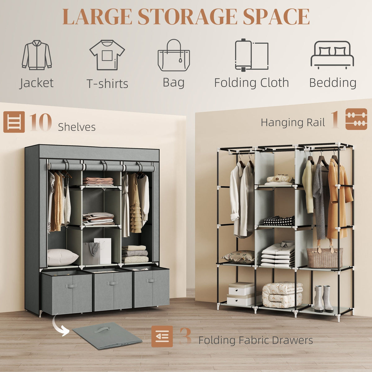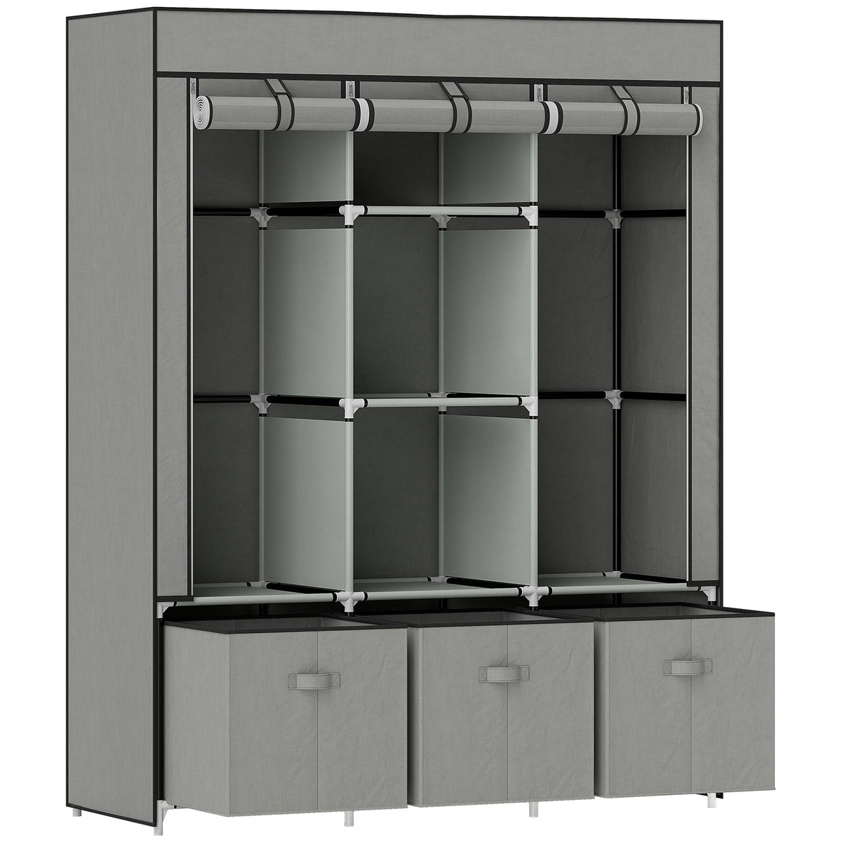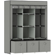HOMCOM Fabric Wardrobe for Bedroom, Portable Wardrobe with 5 Shelves, 2 Hanging Rails and 3 Fabric Drawers, Foldable Closet, 125 x 43 x 162.5cm, Light Grey - Light Grey