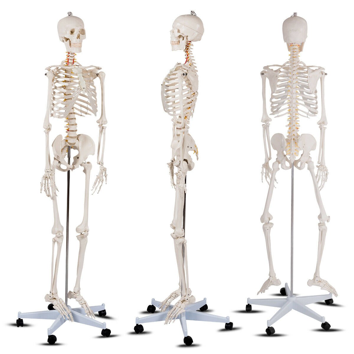 An ideal teaching tool and accessory to support your anatomical learning! Adding a colour poster as a reference supports professional medical studying and research. If you are looking for a human skeleton model like this, do not hesitate to place an order! High Anatomical Correctness with Poster: This human skeleton model uses vivid and clear details to describe and map the human skull, bone structure, sutura, vertebral artery, and nerves with high medical correctness. The anatomical model comes with a colourful poster to help you get the basic idea of human anatomy. Removable and Flexible Parts: The human skeleton has detachable arms & legs & head cap, 3 removable teeth, and a retractable jaw for further anatomical study. And the flexible joints allow you to make different postures on our human skeleton model if you free it from the stand. Realistic Life Size for Medical Research: Modeling 1:1 from a real human skeleton, our anatomical model is an ideal teaching tool and accessory and it is suitable for different occasions. This life size skeleton supports medical research, professional anatomical teaching and studying, as well as an amusing Halloween decoration. Stable Rolling Stand with Brakes: Fixing on a rolling iron-chrome stand with an upright position, this human skeleton is easy to move around between research rooms or classrooms. Equipped with 5 universal casters (2 with brakes), you can keep the stand stably in position. Premium Medical Quality: Constructed with high-quality PVC material, the skeleton model is capable of withstanding a great amount of using time. And the stand is made of rust-proof iron-chrome pipe to expand the lifespan for sure. It can be hand washed for easy cleaning.
