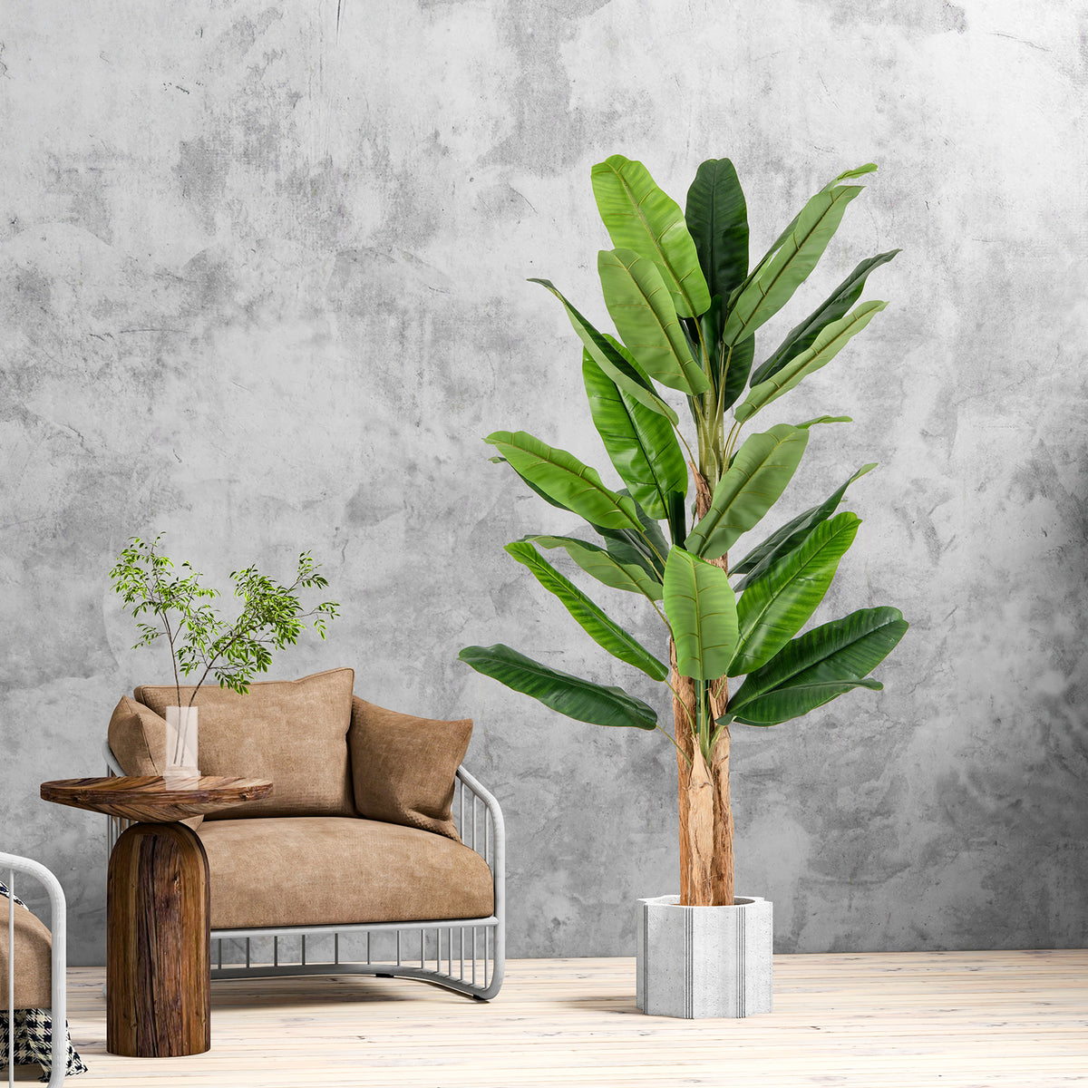 The artificial banana tree is adorned with large leaves, lifelike stalks, natural banana barks, and simulated moss, which replicates the natural beauty of a banana plant. Constructed using high-quality and durable PEVA leaves, this fake banana tree guarantees longevity and a fresh look year-round without the need for sunlight, fertilizers, pruning, or watering. Besides, unlike real plants that easily die of sunburn or water logging, our artificial plant would keep evergreen and requires free maintenance. Thanks to the sturdy cement pot, this tree is stable enough to prevent wobbling or tipping over. The lifelike plant will brighten and refresh any corner, making it a versatile and timeless decoration for homes, offices, porches, stores, and more. Vivid and Full-Bodied Appearance: The artificial banana tree features 27 large leaves and triple lifelike stalks decorated with natural barks of Banana stalks, which captures the essence of a real banana tree, bringing nature's beauty indoors. Premium and Durable Material: The fake banana plant is crafted of premium PEVA leaves and PE stalks, which are non-odor, non-allergic, and not easy to fade or crack, ensuring long-term use. It could maintain its fresh and vibrant look for years to come. Sturdy and Stable Structure: The faux banana tree is supported by a sturdy pot with built-in cement and a thick trunk, keeping the tree stable and upright all the time. Additionally, we suggest placing it in a bigger decorative planter to match your existing decors. No Maintenance Required, Keep Evergreen: In contrast to the real plant that is easy to wither or fade and needs careful maintenance, our artificial plant would not be affected by seasons while keeping vitality all the time. Moreover, it requires no watering, fertilizer, sunlight, or pruning. Versatile Decoration: Whether you need a stunning centerpiece for your living room, a charming addition to your office, or an elegant decoration for a special event, our fake banana leaf tree is the perfect choice. It effortlessly complements any occasion or setting. Note: There are wires in the branches to adjust the tree shape. Please carefully bend the stems outward to get a fluffy shape.