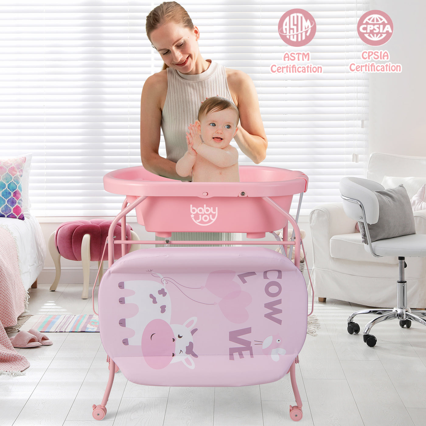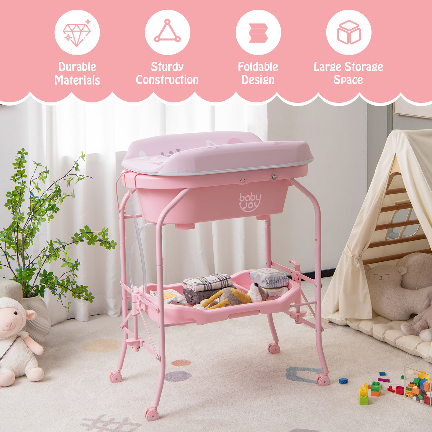 With a practical bathtub, this baby changing station is designed for versatility. It is suitable whether you use it to change diapers for your baby or bathe your baby. And the storage slots as well as the storage basket will hold baby's essentials for easy access. In addition, the reasonable height can effectively relieve your back pains from bending too much. Also, the thoughtful drainage system makes water drainage an easier thing. Most importantly, the selected materials that have passed ASTM and CPSIA certifications ensure reliability and security. When you do not need to use it, you can fold the diaper changing station and store it in the corner to save space. Multipurpose Baby Changing Table: This baby changing table with bathtub allows you to use it to change diapers or clothes for your baby, massage and nurse your baby. By removing the changing pad, you can bathe the baby with the bathtub. Moreover, the large storage basket holds baby's belongings for easy access. Waterproof and Convenient Changing Pad: The changing pad (weight capacity: 11 kg) is water resistant for easy cleaning. By the way, the cute patterns add much fun. More importantly, the changing pad can be flipped over and fixed with the buttons, which is space-saving when not in use. Humanized and Thoughtful Bathtub: This bathtub (58 x 32 x 20 cm) has a curved tray for your baby and 2 practical storage slots for bathing essentials, holding up to 15 kg. Meanwhile, the openable drainage hole pluses the premium drainage tube allow water to flow down, avoid getting up frequently to pour water. Durable and Sturdy Construction: Made of high quality PP material, this diaper changing station is built to last. Moreover, the baby changing table is firmly supported by sturdy metal frame for a steady performance when in service. The ASTM and CPSIA certifications render it more reliable. Movable and Foldable Design: The diaper changing station is equipped with 4 universal wheels that will help move it from one place to another easily. Also, all 4 wheels can be locked for extra stability and safety. What's more, you can fold the diaper changing station within several steps for convenient storage.