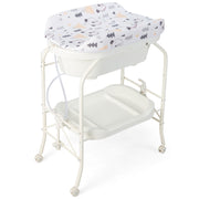 With a practical bathtub, this baby changing station is designed for versatility. It is suitable whether you use it to change diapers for your baby or bathe your baby. And the storage slots as well as the storage basket will hold baby's essentials for easy access. In addition, the reasonable height can effectively relieve your back pains from bending too much. Also, the thoughtful drainage system makes water drainage an easier thing. Most importantly, the selected materials that have passed ASTM and CPSIA certifications ensure reliability and security. When you do not need to use it, you can fold the diaper changing station and store it in the corner to save space. Multipurpose Baby Changing Table: This baby changing table with bathtub allows you to use it to change diapers or clothes for your baby, massage and nurse your baby. By removing the changing pad, you can bathe the baby with the bathtub. Moreover, the large storage basket holds baby's belongings for easy access. Waterproof and Convenient Changing Pad: The changing pad (weight capacity: 11 kg) is water resistant for easy cleaning. By the way, the cute patterns add much fun. More importantly, the changing pad can be flipped over and fixed with the buttons, which is space-saving when not in use. Humanized and Thoughtful Bathtub: This bathtub (58 x 32 x 20 cm) has a curved tray for your baby and 2 practical storage slots for bathing essentials, holding up to 15 kg. Meanwhile, the openable drainage hole pluses the premium drainage tube allow water to flow down, avoid getting up frequently to pour water. Durable and Sturdy Construction: Made of high quality PP material, this diaper changing station is built to last. Moreover, the baby changing table is firmly supported by sturdy metal frame for a steady performance when in service. The ASTM and CPSIA certifications render it more reliable. Movable and Foldable Design: The diaper changing station is equipped with 4 universal wheels that will help move it from one place to another easily. Also, all 4 wheels can be locked for extra stability and safety. What's more, you can fold the diaper changing station within several steps for convenient storage.