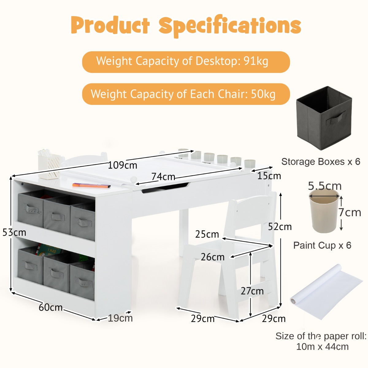 Colour: Natural + White Material: MDF Table Overall Dimension: 109 x 60 x 53 cm (L x W x H) Chair Overall Dimension: 29 x 29 x 52 cm (L x W x H) Storage Bin Dimension: 15 x 18 x 18 cm (L x W x H) Table Max Weight Capacity: 91 kg Chair Max Weight Capacity: 50 kg Net Weight: 24 kg Box Qty:1(May vary by batch)Package includesÔºö 1 x Kids Art Table 2 x Chairs 6 x Storage Boxes 6 x Pigment Cans 1 x Instruction Manual
